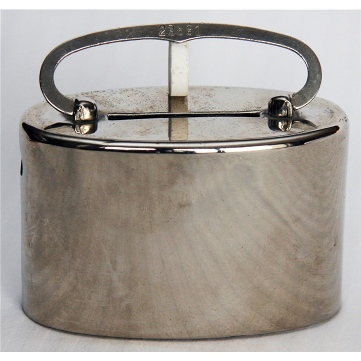 NO Name. An Oval Satchel bank. Opening on top. Handle present. Key lock, with key present. Serial No. 38253. 9cm x 6cm x 4 1/2cm. Nickel plated steel. ‘The Portable Safe’. Automatic Recording Safe Co., Chicago, USA. AU, original white box of issue.