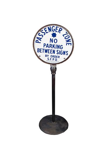 NO PARKING Sign  2-sided round porcelain  14 " diameter sign mfg by Patrick Co. San Francisco    on stand mfg by Standard Specialty Co.  Oakland Ca