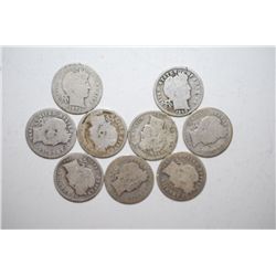 1892 (2), 1898, 1900, 1901, 1901-O, 1902-O, 1903-O & 1904 Barber One Dime; Lot of 9; EST. $20-30