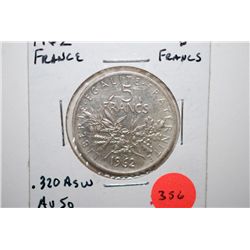 1962 France 5 Francs Foreign Coin; AU50; .320 ASW; EST. $5-15