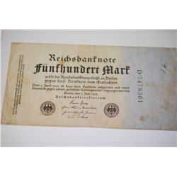 1922 German Funfhundert Mark Foreign Bank Note; EST. $3-5