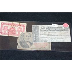 1864 Mechanics Saving & Loan Assoc. 25 Cent Bond, 1874 US 25 Cent Fractional Currency & China 1 Cent Foreign Bank Note; Total Lot of 3