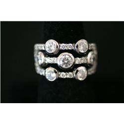 Sterling Silver Ring W/Three Rows of Round White Gemstones; .925 Silver
