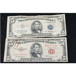 1953-A US Silver Certificate $5; Blue Seal & 1953-C United States Note $5; Red Seal; Total Lot of 2