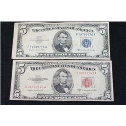 1953-B US Silver Certificate $5; Blue Seal & 1953-B United States Note $5; Red Seal; Total Lot of 2