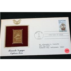1984 First Day of Issue 22K Gold Replica Stamp W/Postal Stamp; Roanoke Voyages Explorers Series