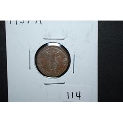 1937-A German 1 Reichspfennig Foreign Coin With Flying Eagle Holding Swatstika; EST. $10-15114 - 1937-A German 1 Reichspfennig Foreign Coin With Flying Eagle Holding Swatstika; EST. $10-15