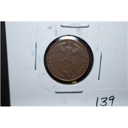 1937-A German 1 Reichspfennig Foreign Coin With Flying Eagle Holding Swatstika; EST. $10-15139 - 1937-A German 1 Reichspfennig Foreign Coin With Flying Eagle Holding Swatstika; EST. $10-15