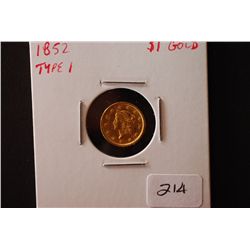 1852 US Liberty $1 Gold Coin Type I; EST. $150-200214 - 1852 US Liberty $1 Gold Coin Type I; EST. $150-200