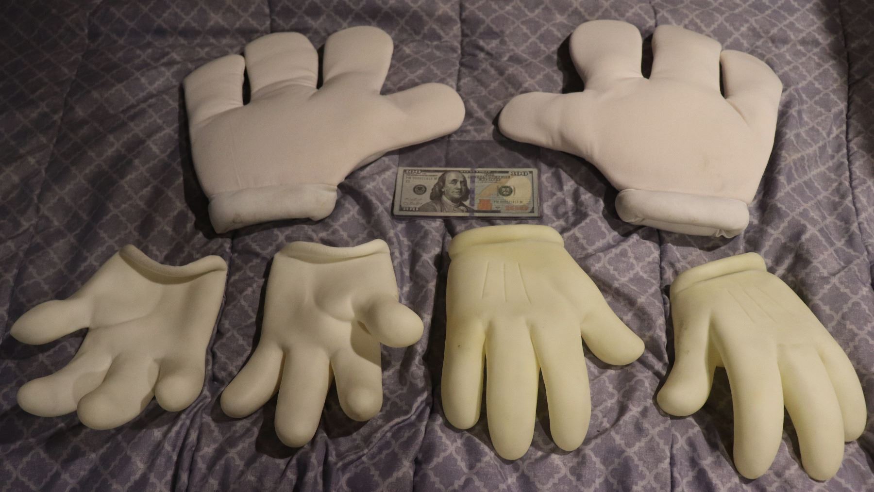 Cloth hands are hand sewn. Latex pairs may be store bought.