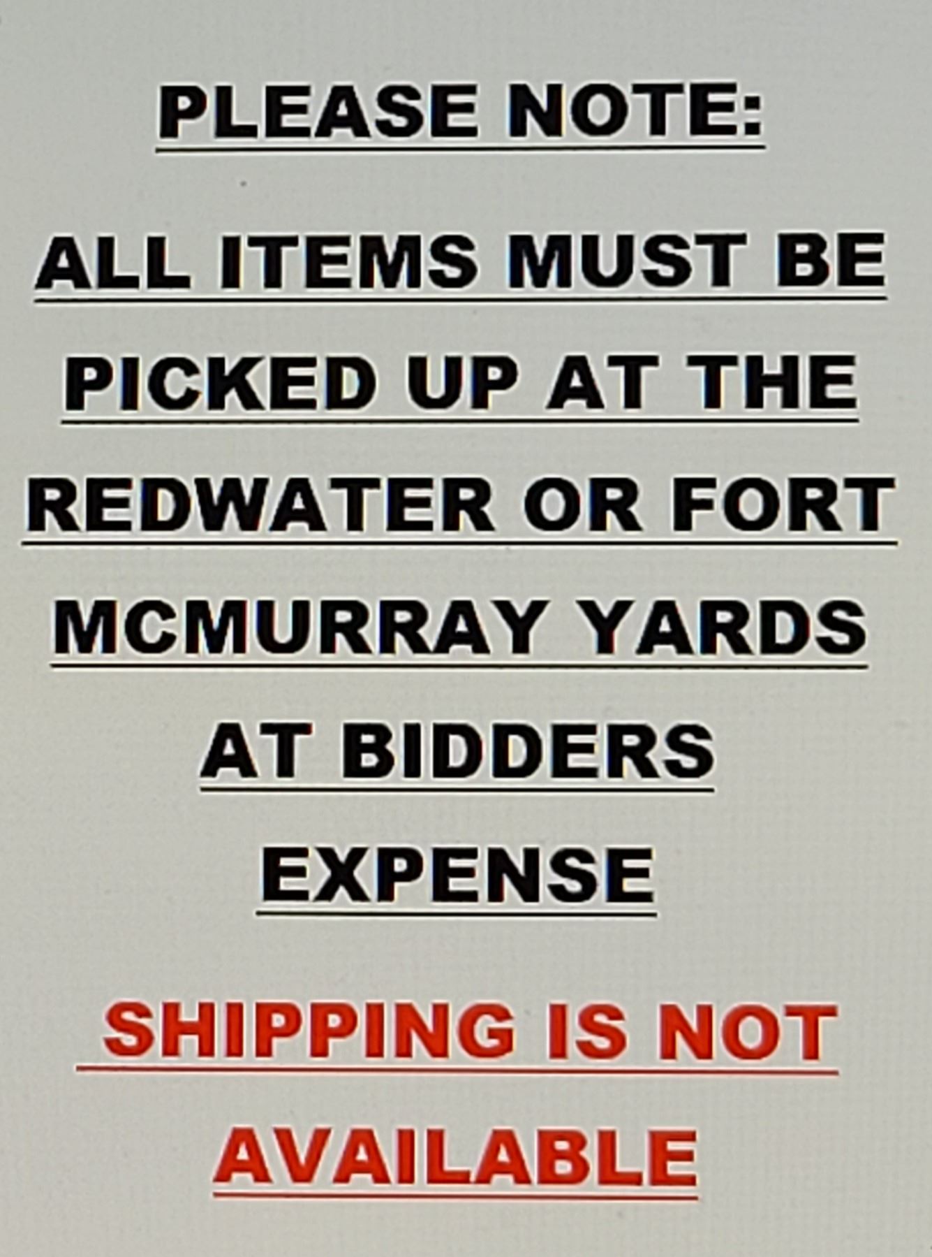 ALL ITEMS MUST BE PICKED UP AT THE REDWATER OR FORT MCMURRAY YARDS AT BIDDERS EXPENSE