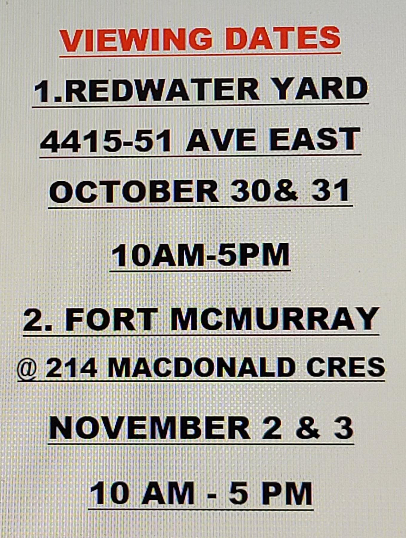 VIEWING: FORT MCMURRAY YARD NOVEMBER 2ND AND 3R 10-5PM DAILY.