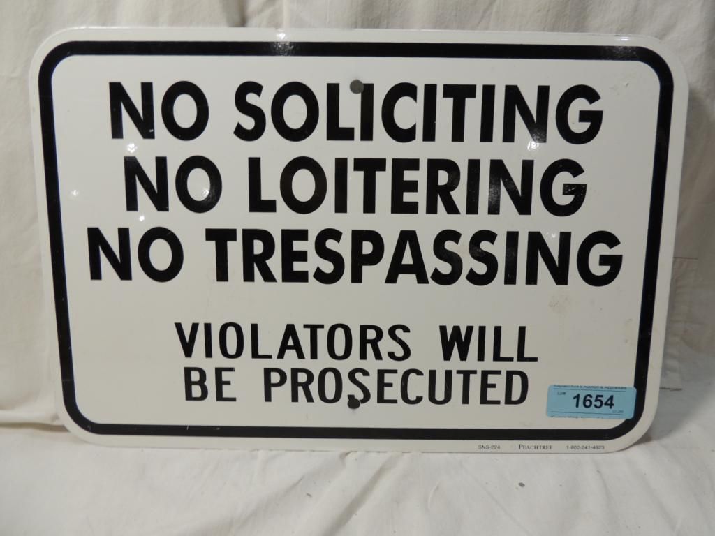 NO SOLICITING NO LOITERING NO TRESPASSING SIGN VIOLATORS WILL BE PROCECUTED. AS SHOWN. SEE PHOTO FOR MORE DETAILS.