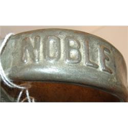 NOBLE ALUMINUM MILK CAN with handle. Marked on handle "Noble". Marked on top of body "Noble Milk Inc." Marked near bottom of body "Madew by H.E. Wright Company-Charleston-Boston, MA" Wooden stopper. 14" H