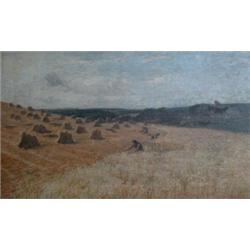 NOBLE, James Campbell, 1846-1913. "Haymaking". Huile sur toile, signée et datée "83". Signée verso. École écossaise. Oil on canvas, signed and dated "83". Signed verso. Scottish School. Provenance: Irene Walton, Montreal. 18" x 30" - 45.6cm x 76.2cm. $1500/2500