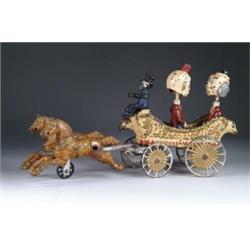 NODDERS WAGON BY HUBLEY MANUFACTURING. An extremely rare comic toy and perhaps one of the hardest pieces to find. The double eagle wagon consists of gloomy gus driving, an oversized happy hooligan nodder and an oversized foxy grandpa nodder. An amazing toy, almost identical to the Kenton version (Happy Foxy Nodding toy). SIZE: 14” l. CONDITION: Nodder figures are replacements. Overall good to very good. JL 1-3830 (10,000-12,000)