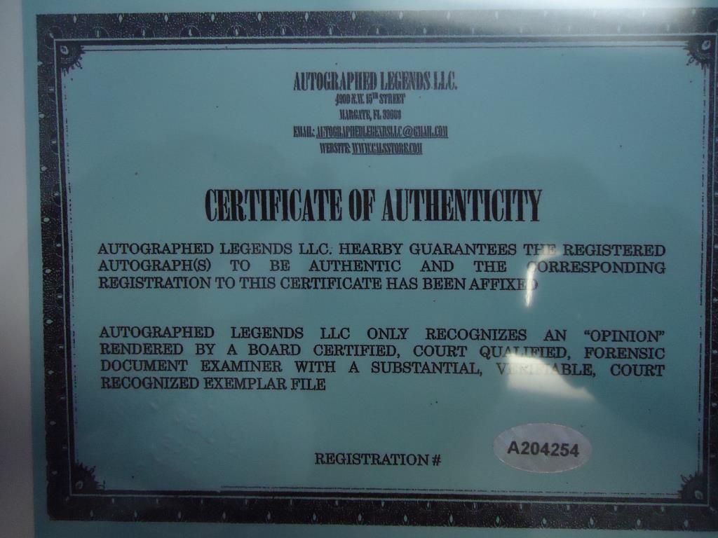 BEING SOLD AS IS, PLEASE USE YOUR OWN JUDGEMENT. CONTACT 1-954-974-1104 AT AUTOGRAPHED LEGENDS WITH ANY QUESTIONS ABOUT THEM, THIS IS THE PERSON WHO AUTHENTICATED THEM. WE ARE NOT AUTOGRAPH EXPERTS AND CANNOT GUARANTEE THEM OURSELVES.