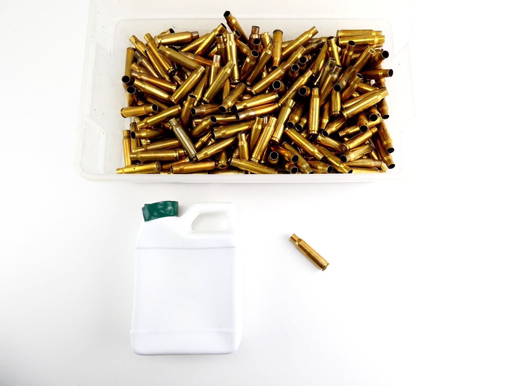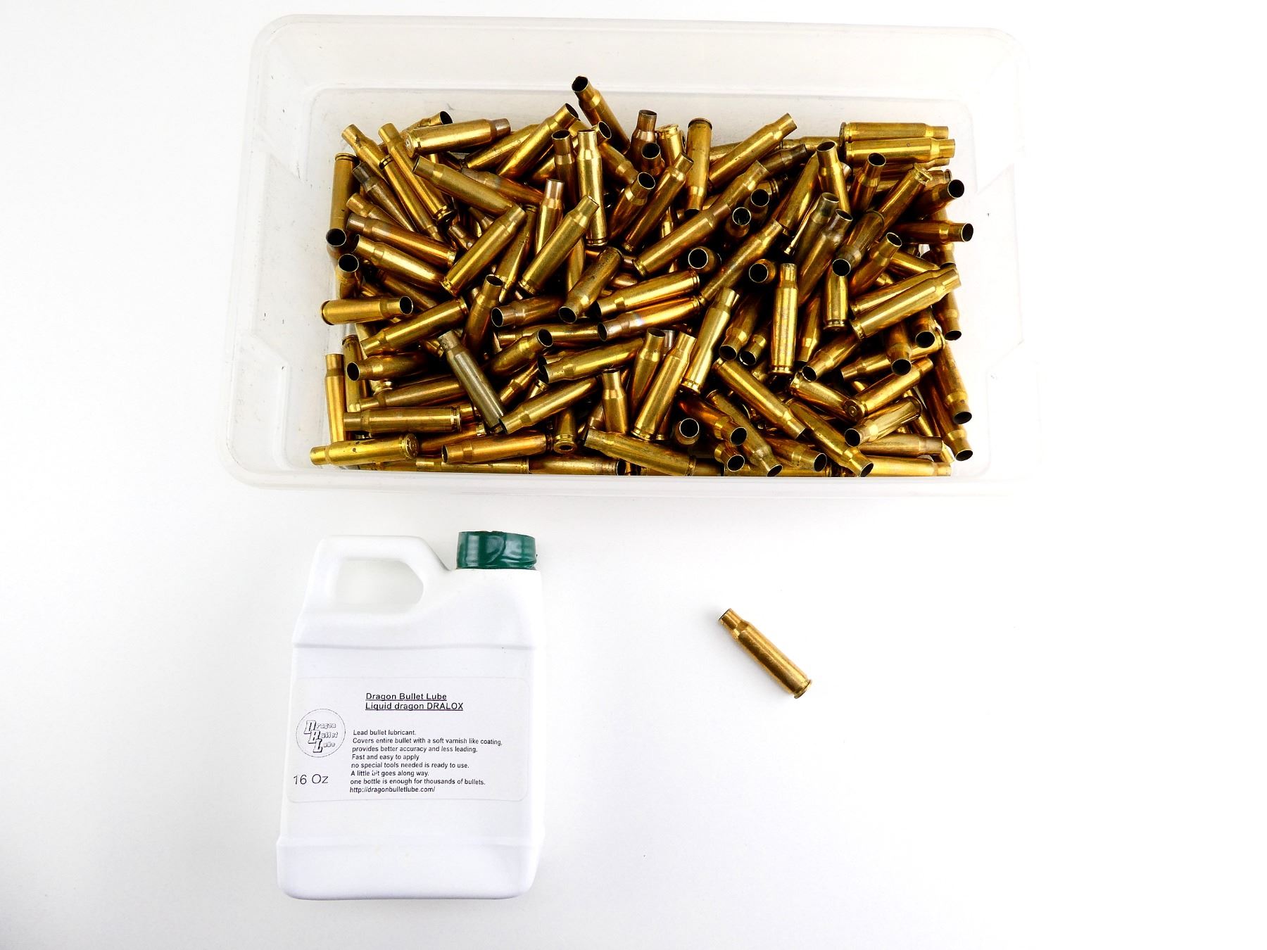 LOT INCLUDES; APPROX. 5 LBS NON-PRIMED BRASS CASES, (1) JUG DRAGON BULLET LUBE LIQUID DRAGON DRALOX, APPROX. 14 OZ.