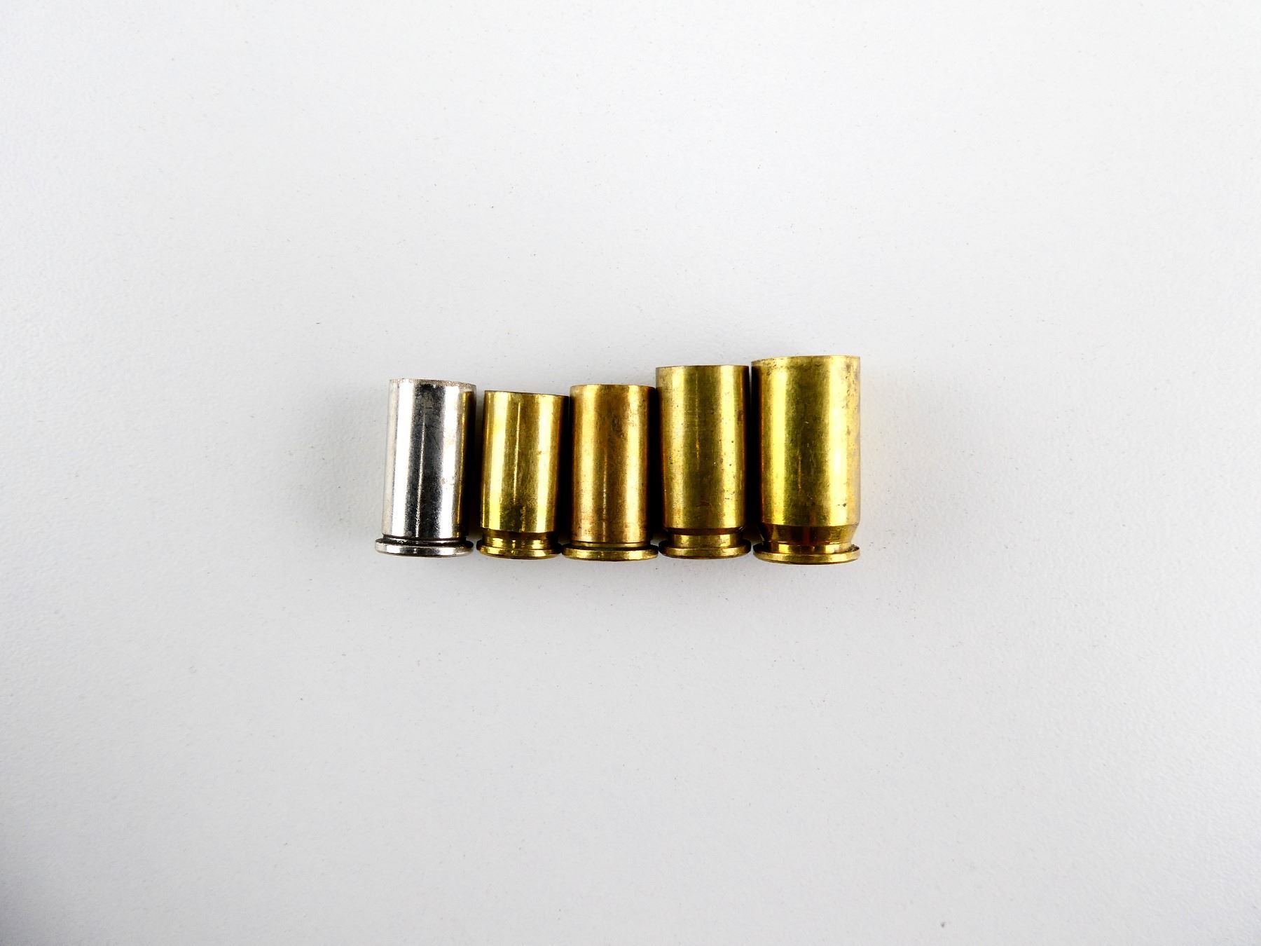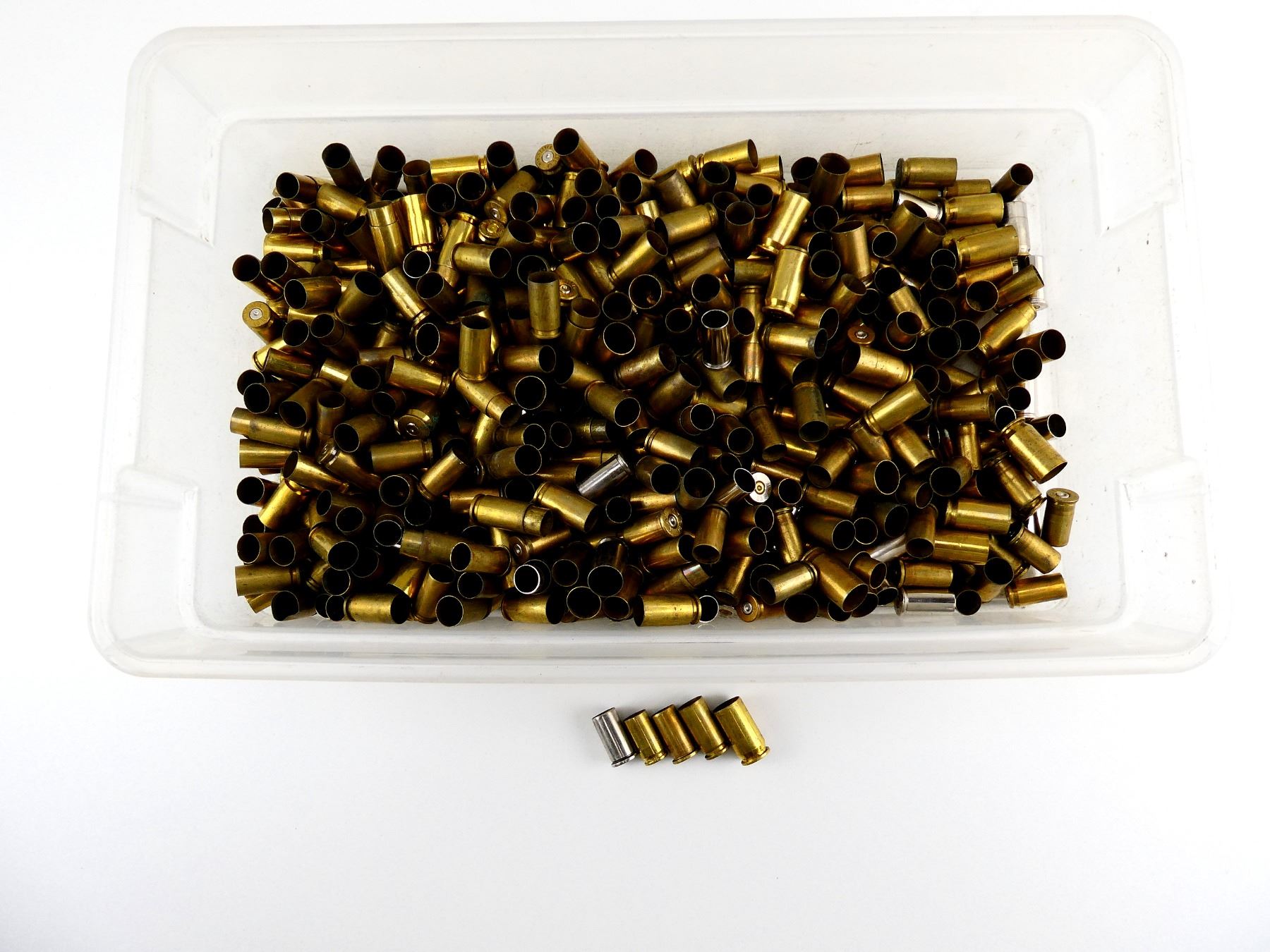 LOT INCLUDES; APPROX. 6 LBS NON-PRIMED CASES, VARIOUS CALIBERS INCLUDING; 9MM LUGER, .38 S&W, .40 S&W, .45 AUTO, ETC.