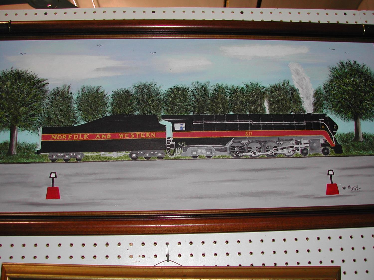 NORFOLK AND WESTERN LOCOMOTIVE 611, OIL CANVAS, PAINTED BY M. PAYNE 1989 (19X39)
