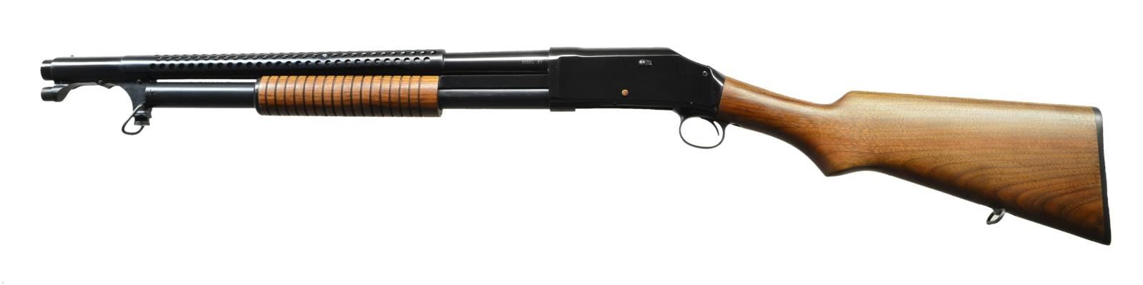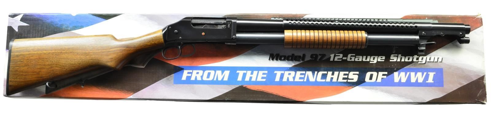 Cal. 12 Ga., 2 3/4". S# MIL5187. Norinco copy of WWI Winchester 1897 Trench Shotgun w/ similar features & markings. IAC import marked 20 3/4" bbl. w/ fixed cyl. bore. Blue finish. Walnut stock set w/ sling swivel & buttplate. UNATTACHED ACCESSORIES: matching numbered box & sleeve w/ manual. CONDITION: near excellent w/ storage residue & light wear. Shiny bore. (22-2637/MD). MODERN. $600-900.