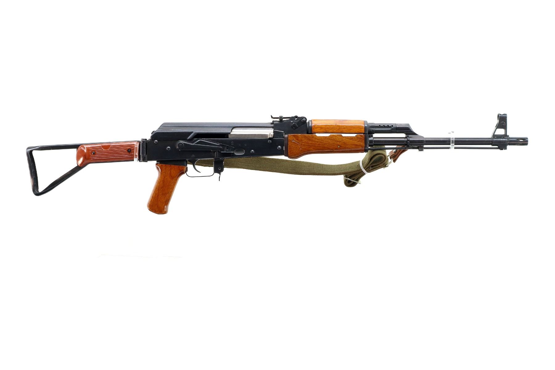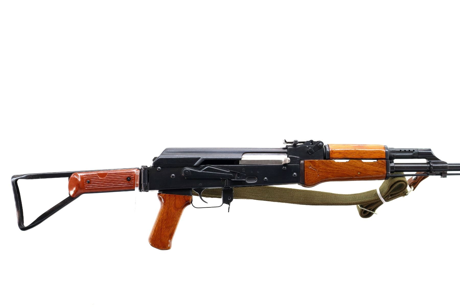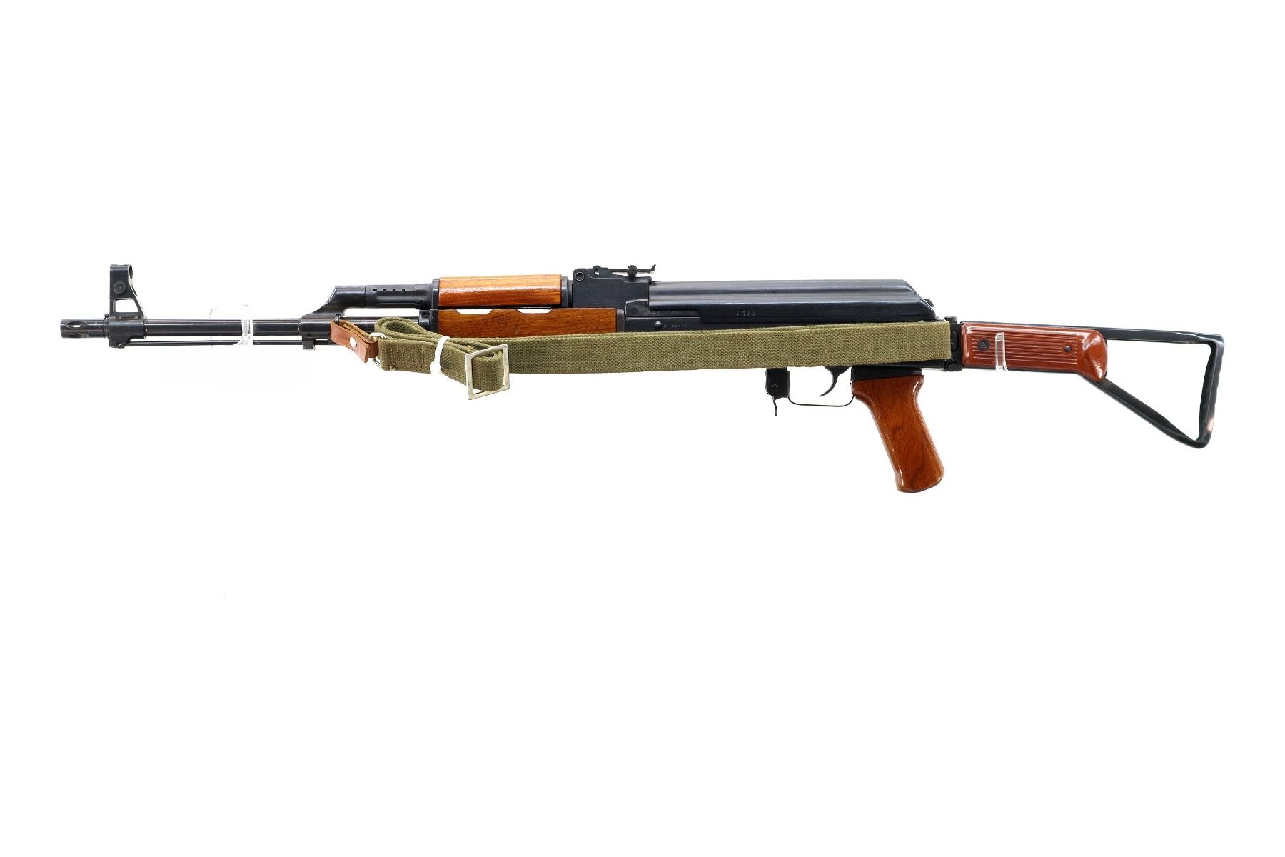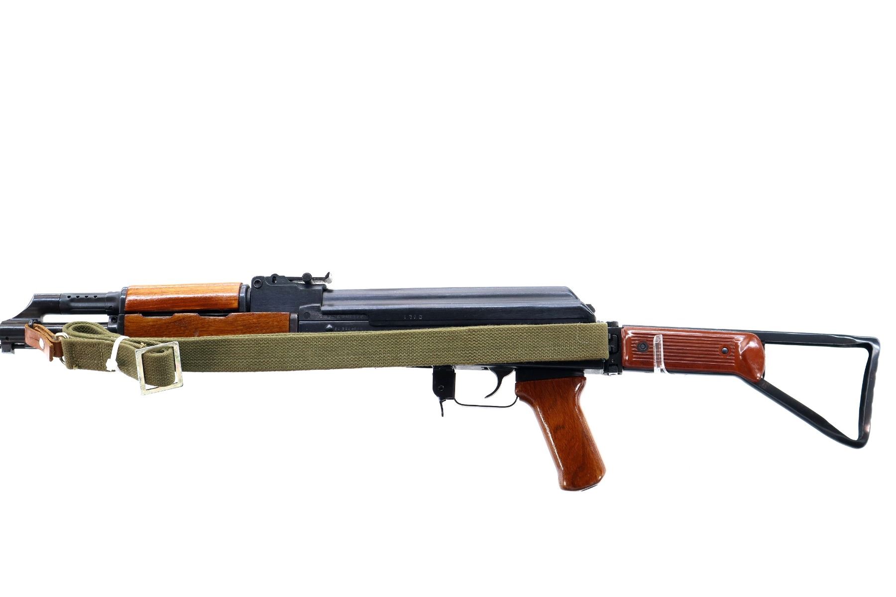 Main Description: 12-5 Prohibited, Manufactured by Factory 66, visible numbers match. Post front sight with hood and ramp, adjustable u notched rear sight, blued finish, smooth top cover, silver bolt and carrier. Three piece full military wood stocks, ventilated handguard, pistol grip, attached folding stamped steel butt stock with Two piece grooved brown polymer inserts. Sling swivels with green canvas military sling, cleaning rod and threaded muzzle with ported brake installed.