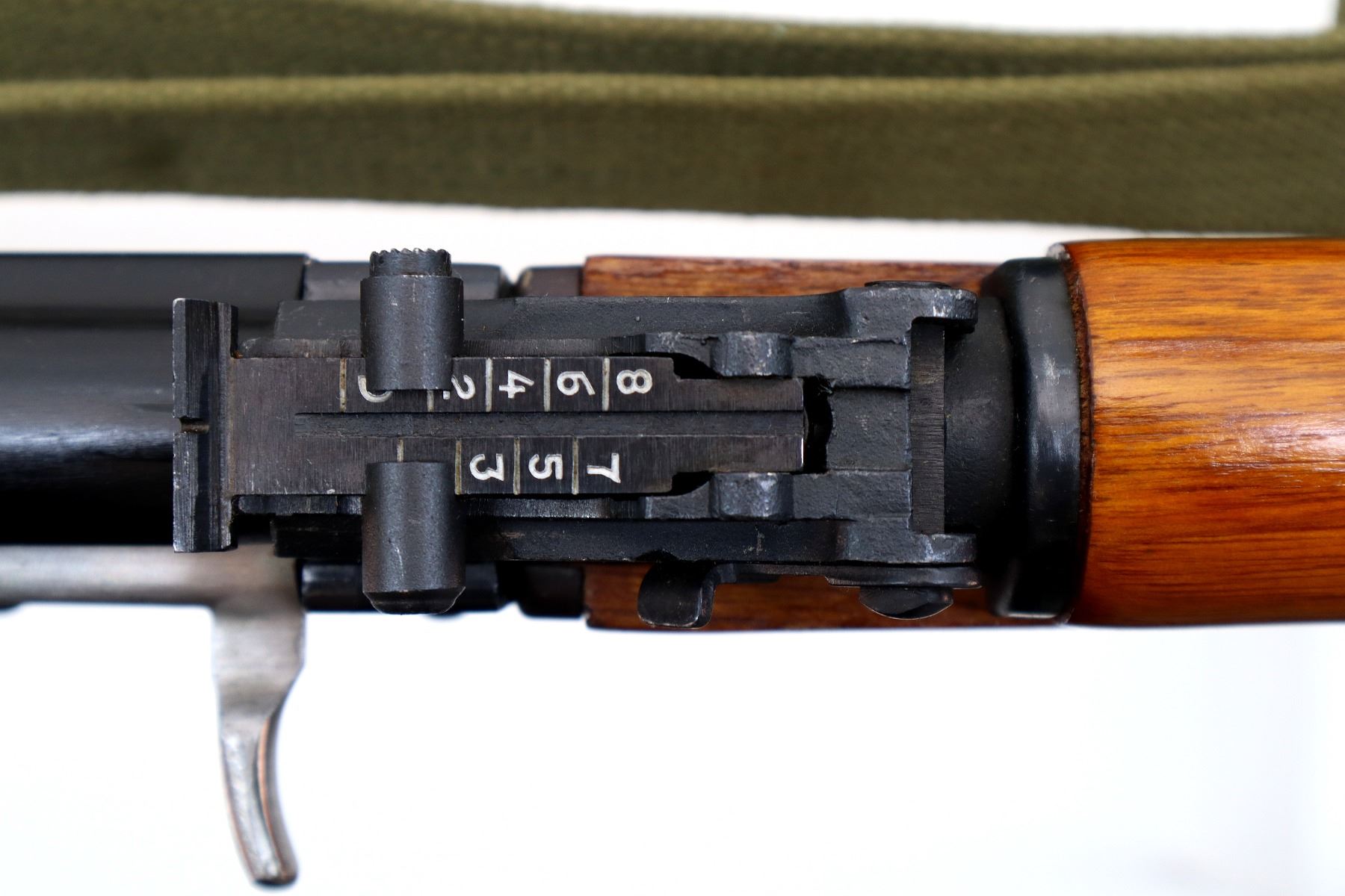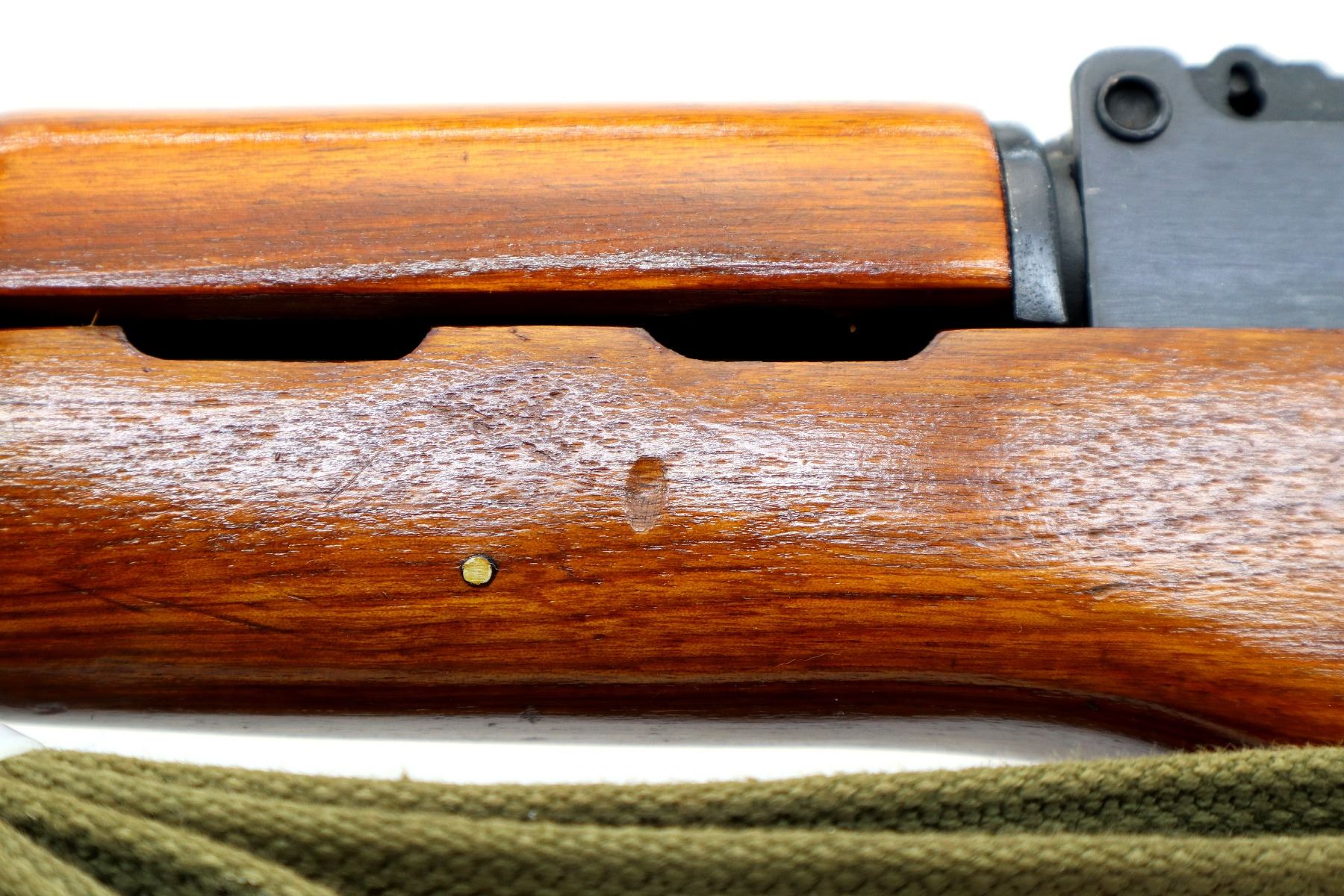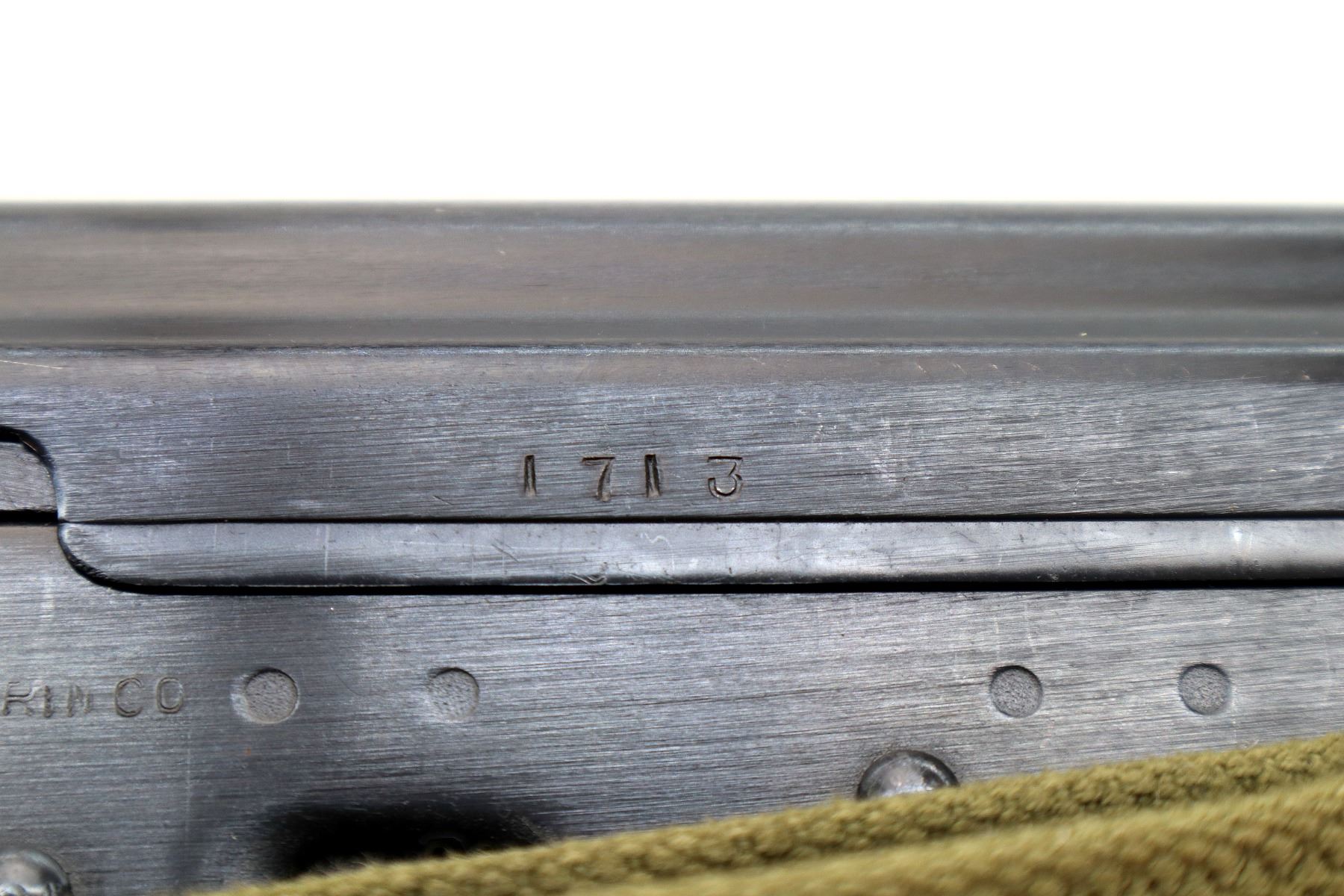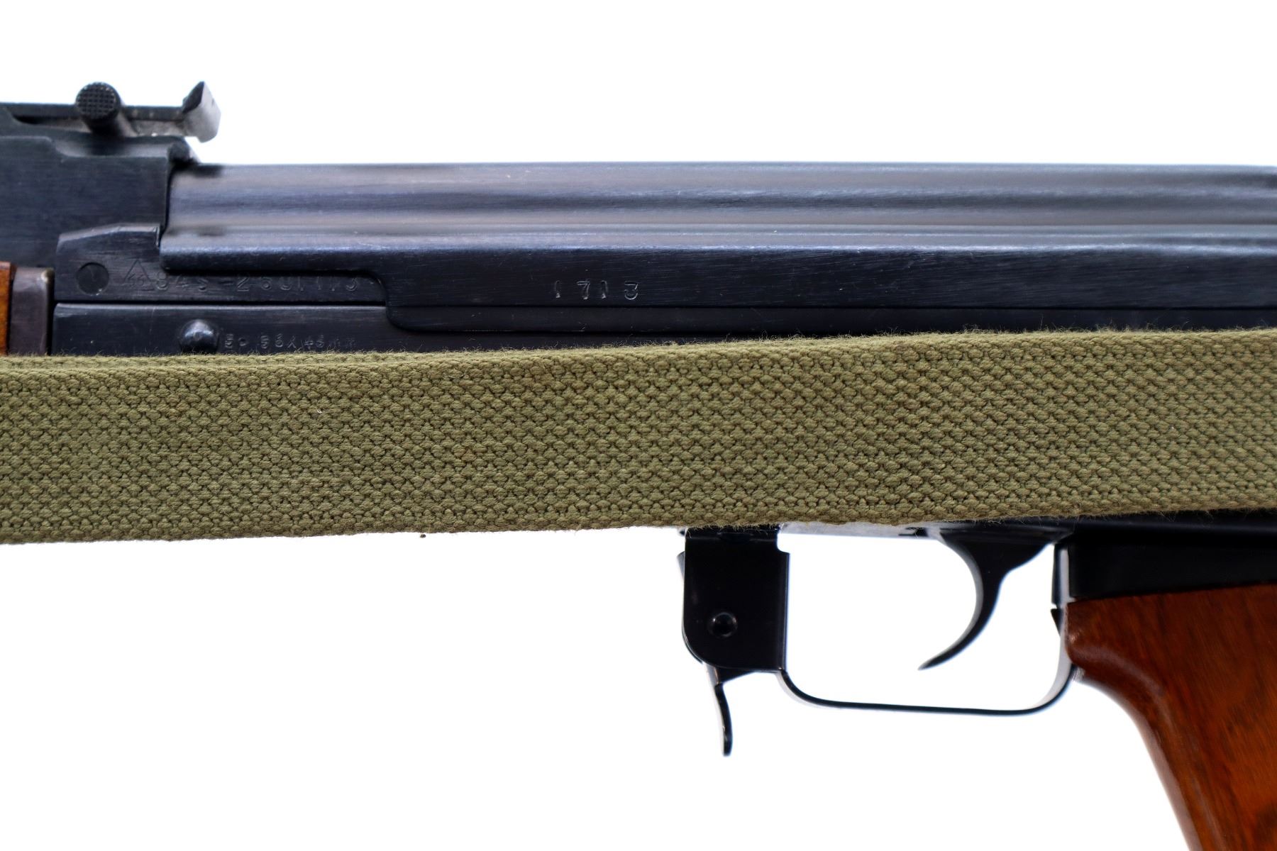 Main Description: 12-5 Prohibited, Manufactured by Factory 66, visible numbers match. Post front sight with hood and ramp, adjustable u notched rear sight, blued finish, smooth top cover, silver bolt and carrier. Three piece full military wood stocks, ventilated handguard, pistol grip, attached folding stamped steel butt stock with Two piece grooved brown polymer inserts. Sling swivels with green canvas military sling, cleaning rod and threaded muzzle with ported brake installed.