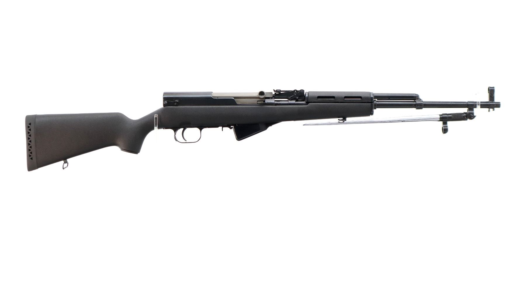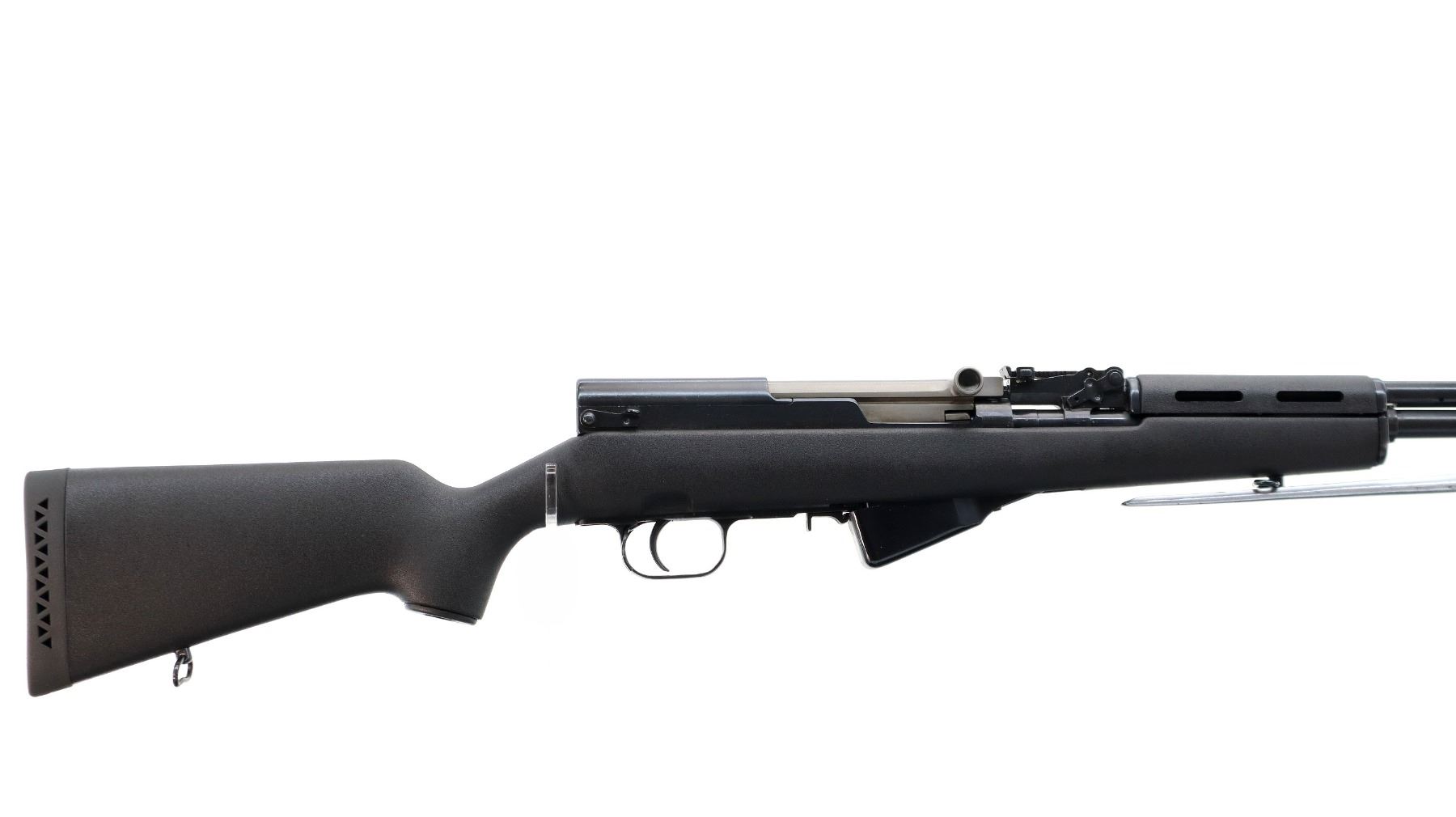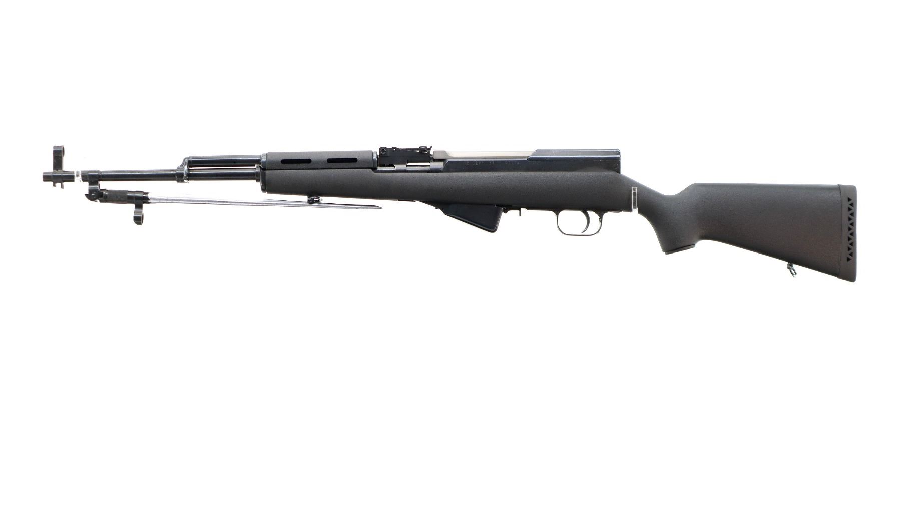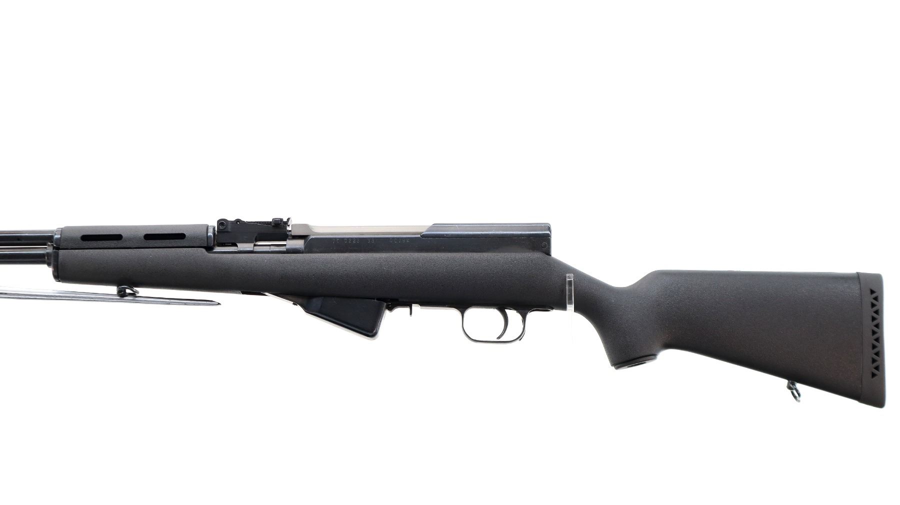 Main Description: Visible numbers match. Post front sight with hood and ramp, adjustable u notched rear sight, blued finish, silver bolt and carrier. Two piece black synthetic stocks, ventilated handguard, pistol grip, black rubber recoil pad, grip cap, sling swivels, attached folding cruciform bayonet, missing cleaning rod.