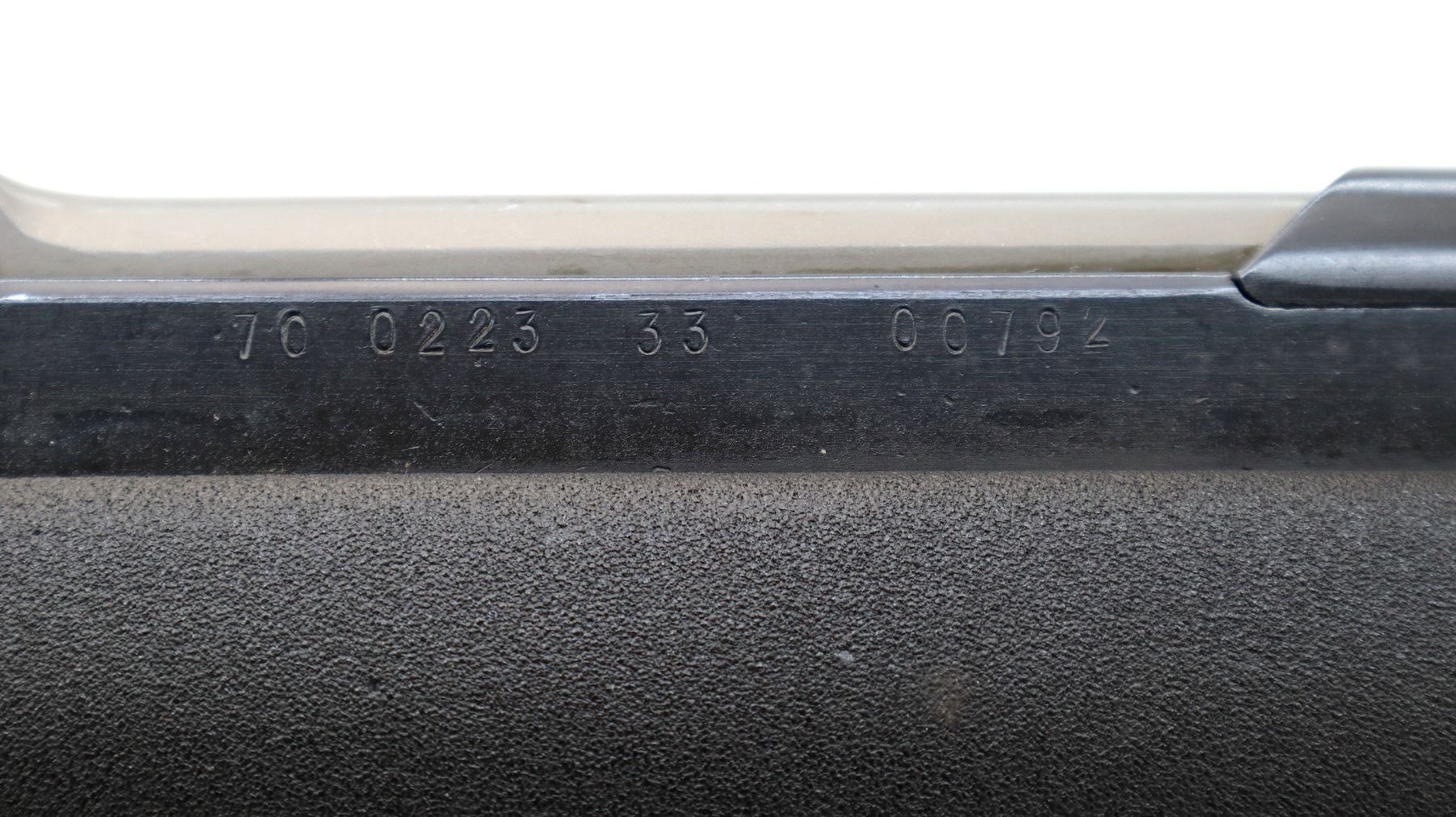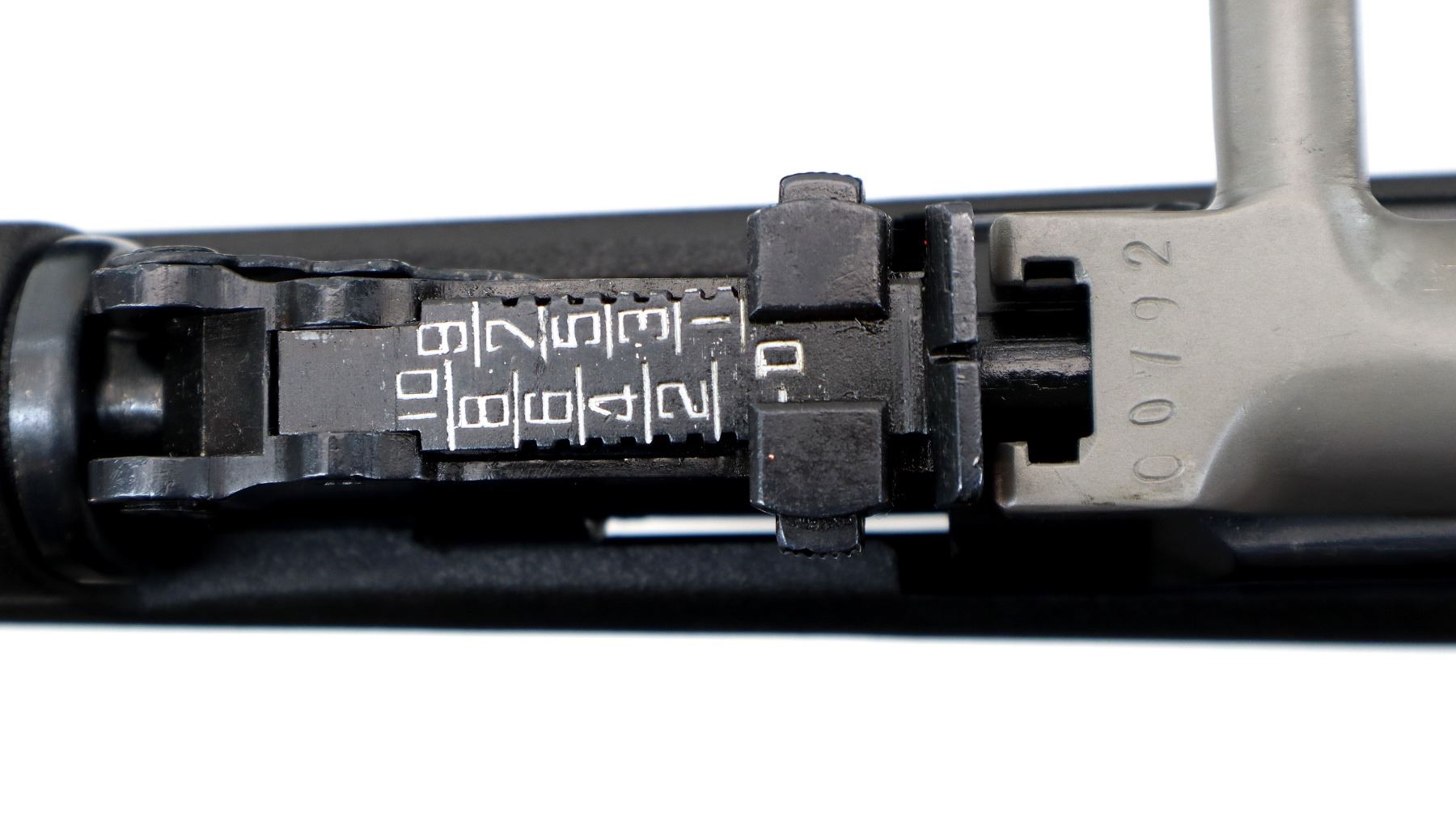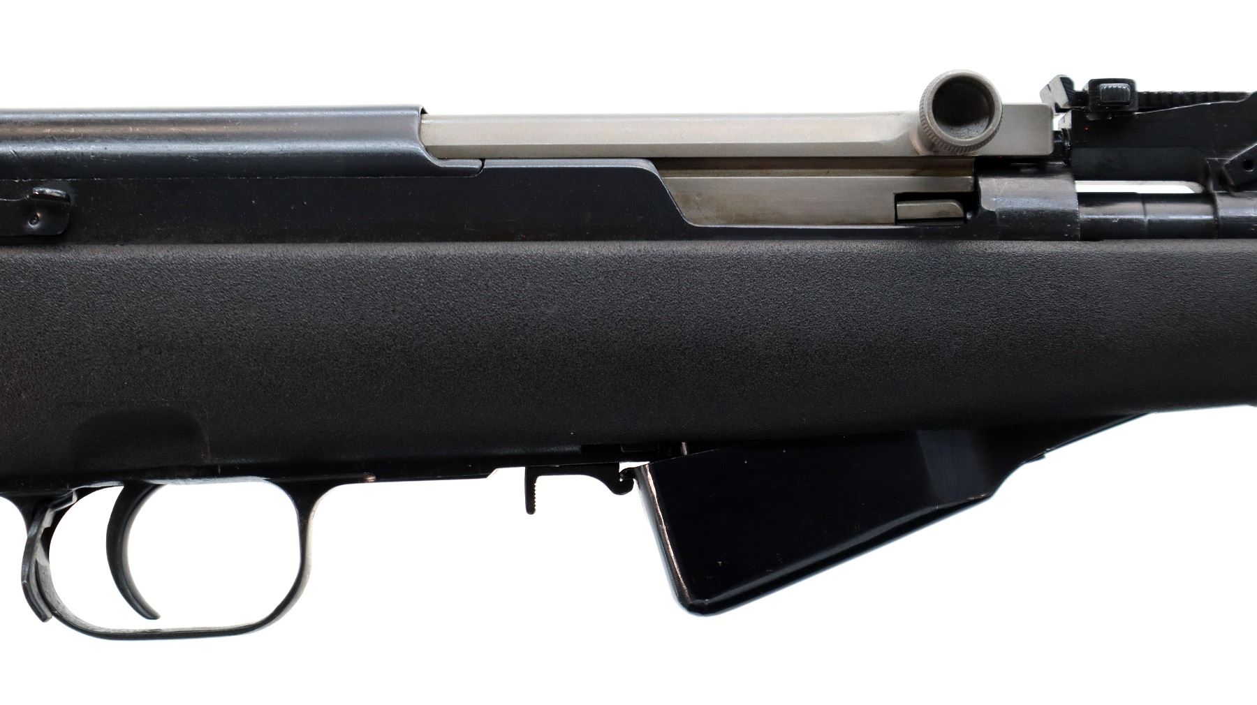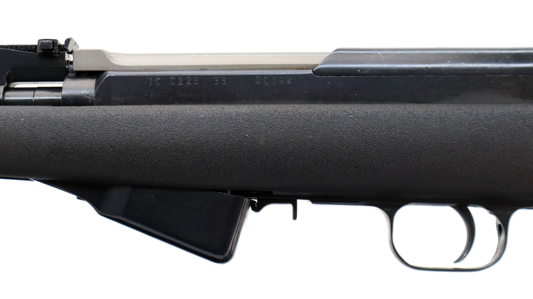 Main Description: Visible numbers match. Post front sight with hood and ramp, adjustable u notched rear sight, blued finish, silver bolt and carrier. Two piece black synthetic stocks, ventilated handguard, pistol grip, black rubber recoil pad, grip cap, sling swivels, attached folding cruciform bayonet, missing cleaning rod.