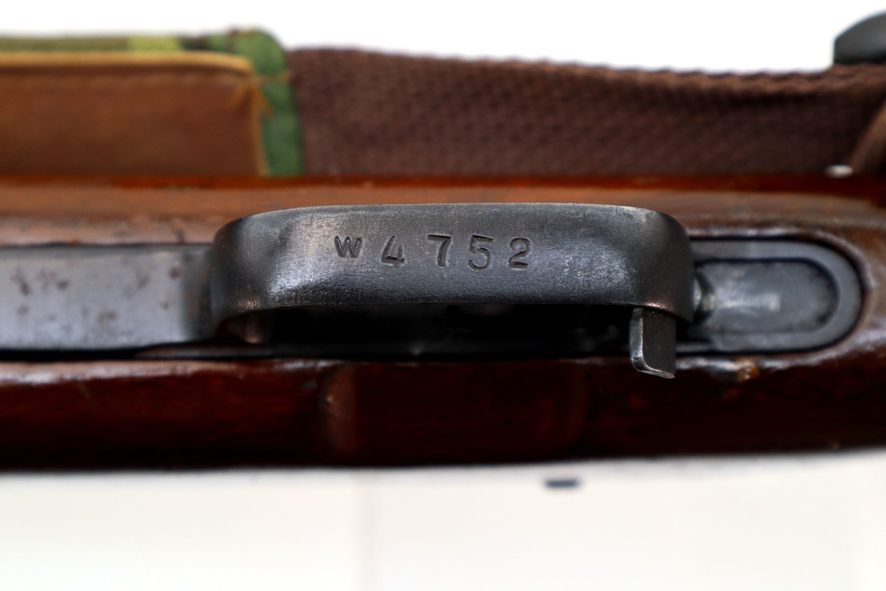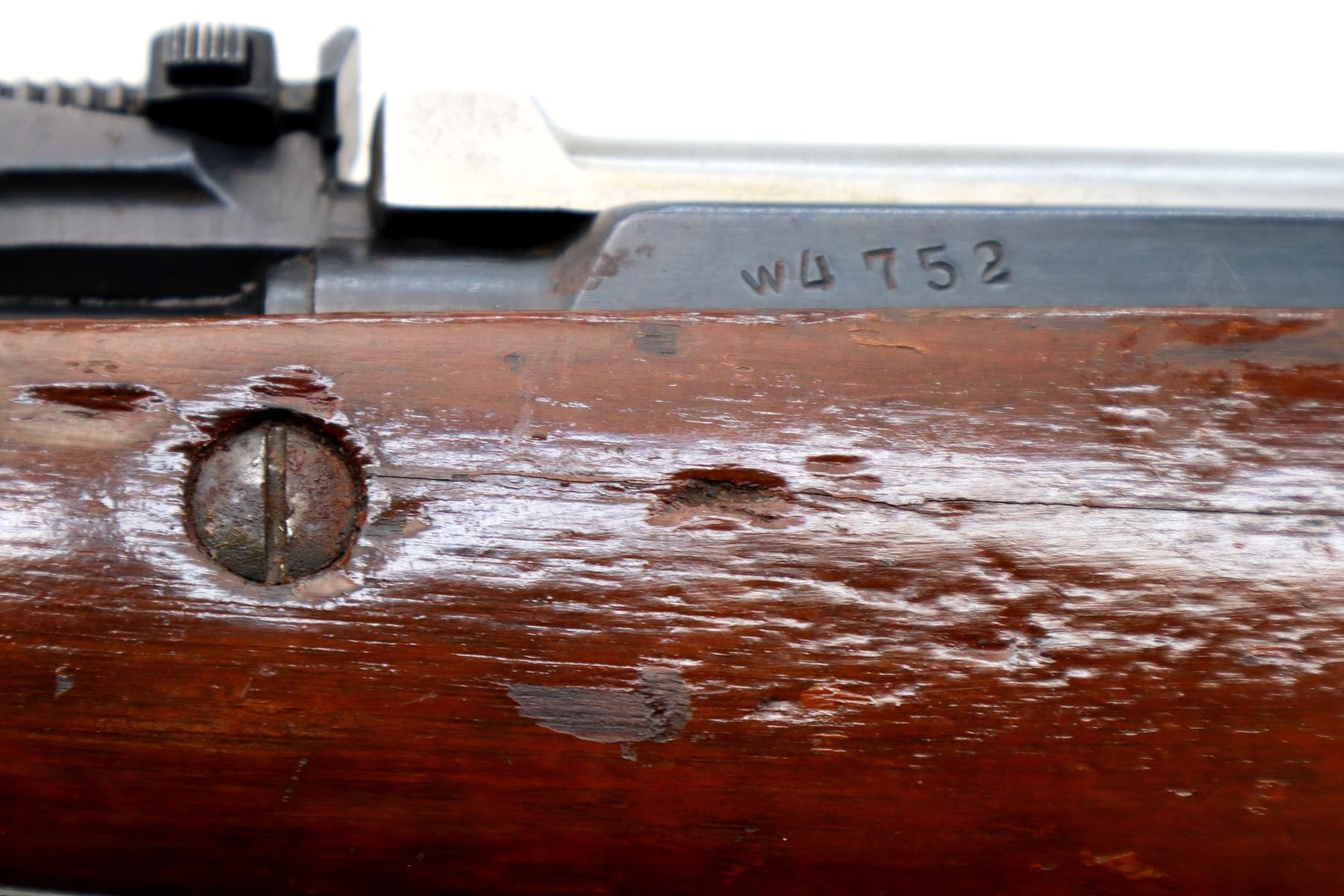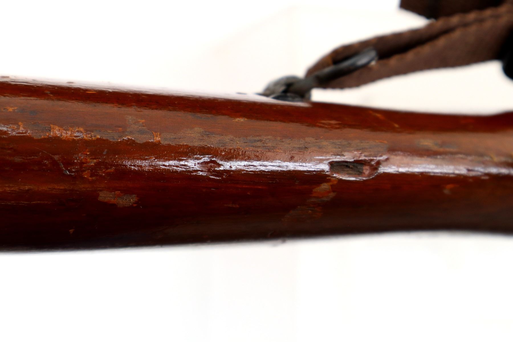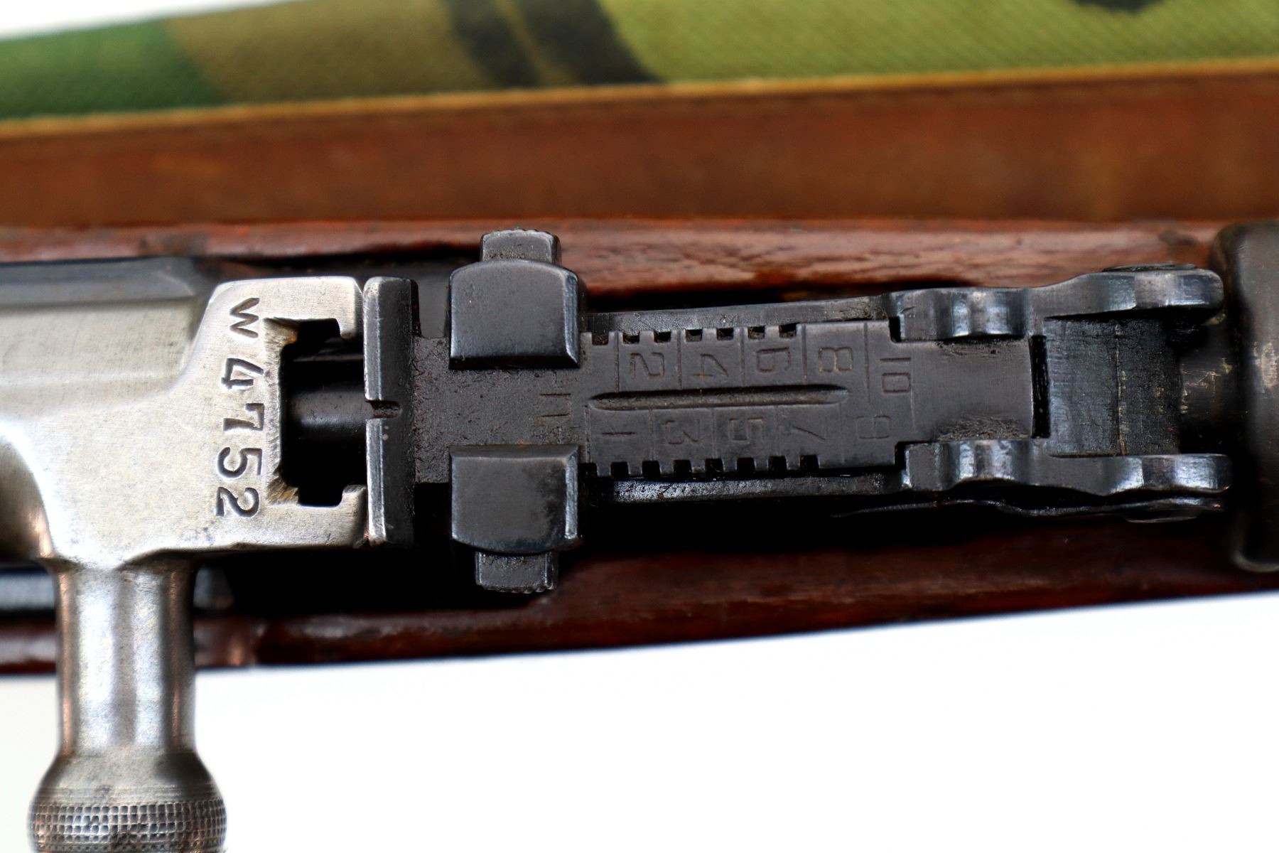 Main Description: Visible serial numbers match. Post front sight with hood and ramp, adjustable u notched rear sight, blued finish, silver bolt and carrier. Two piece full military wood stocks, ventilated handguard, finger grooved forearm, pistol grip cracked on left side beside receiver, smooth steel butt plate with trap, sling swivels with Camo nylon sling, cleaning rod, attached folding blade bayonet.