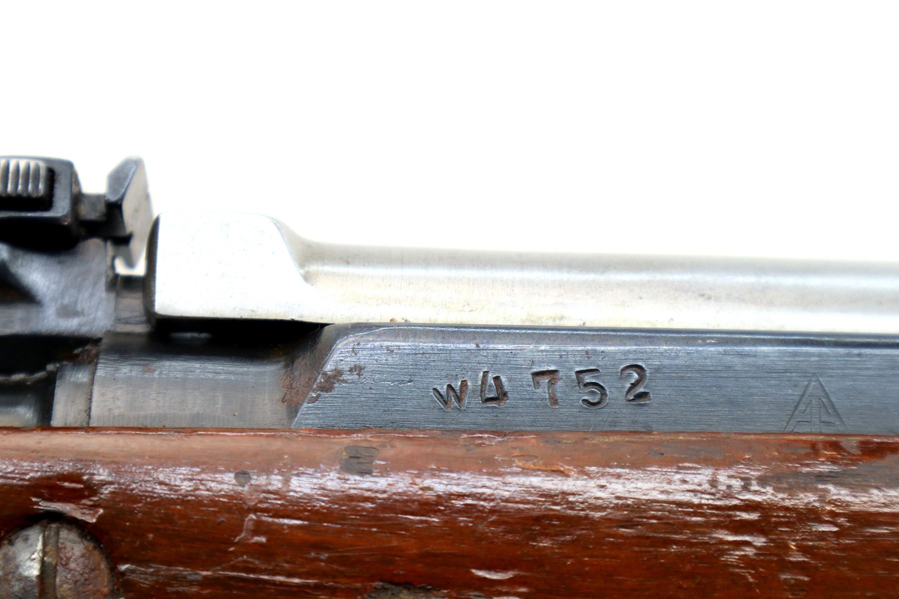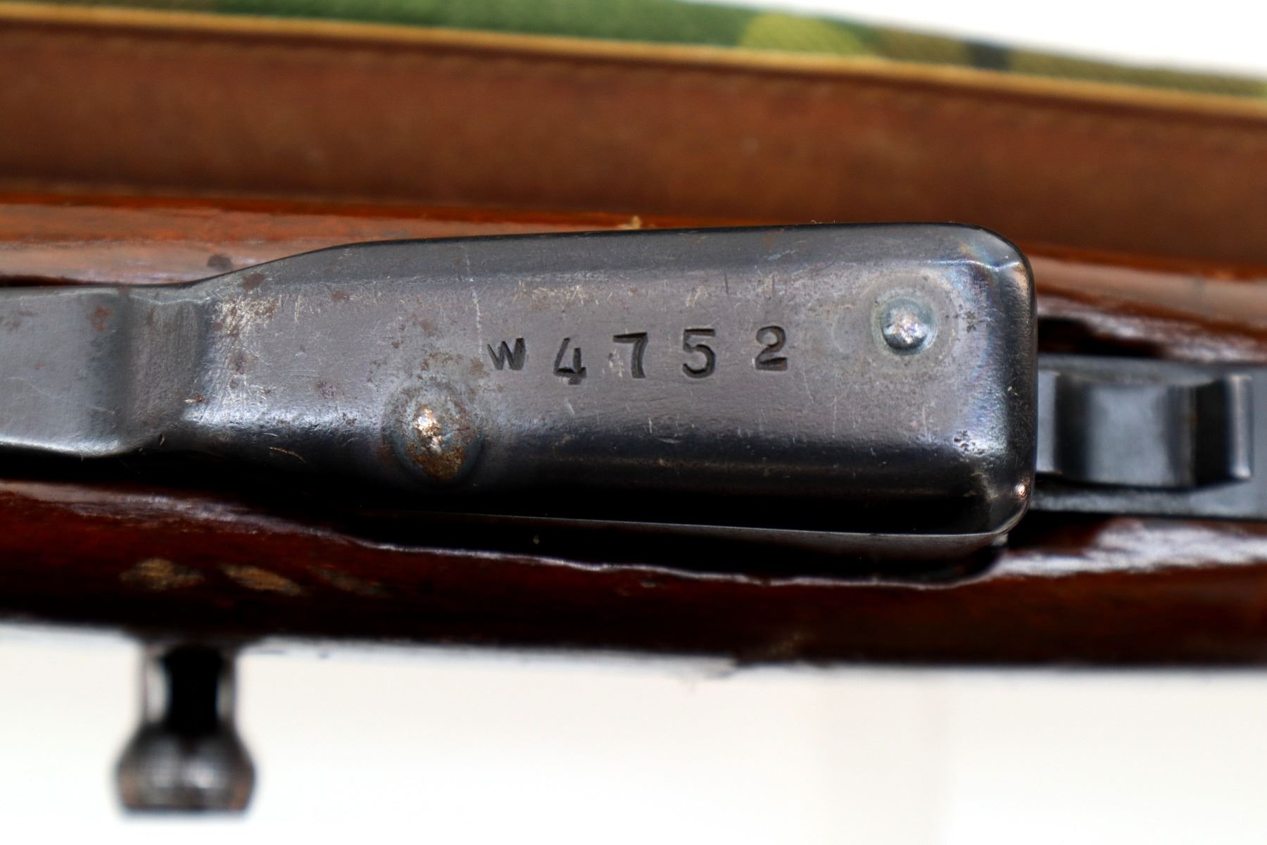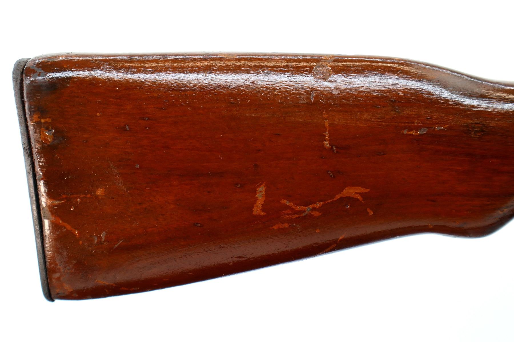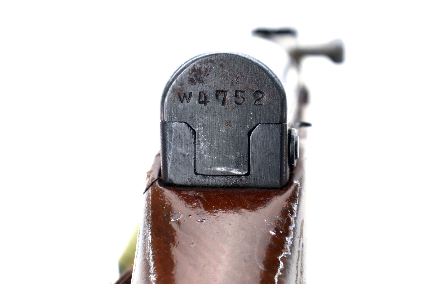 Main Description: Visible serial numbers match. Post front sight with hood and ramp, adjustable u notched rear sight, blued finish, silver bolt and carrier. Two piece full military wood stocks, ventilated handguard, finger grooved forearm, pistol grip cracked on left side beside receiver, smooth steel butt plate with trap, sling swivels with Camo nylon sling, cleaning rod, attached folding blade bayonet.