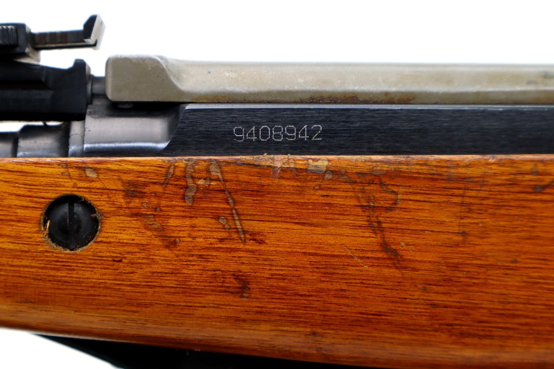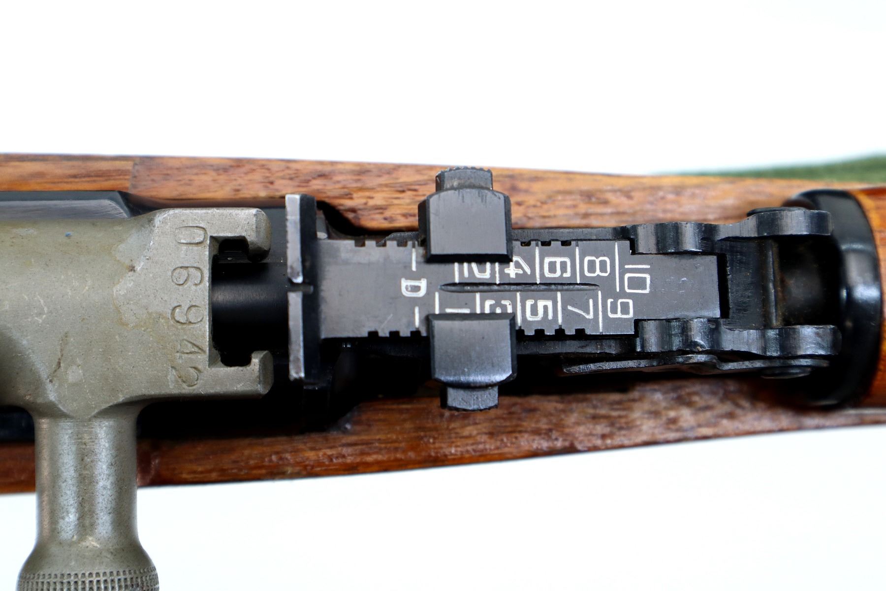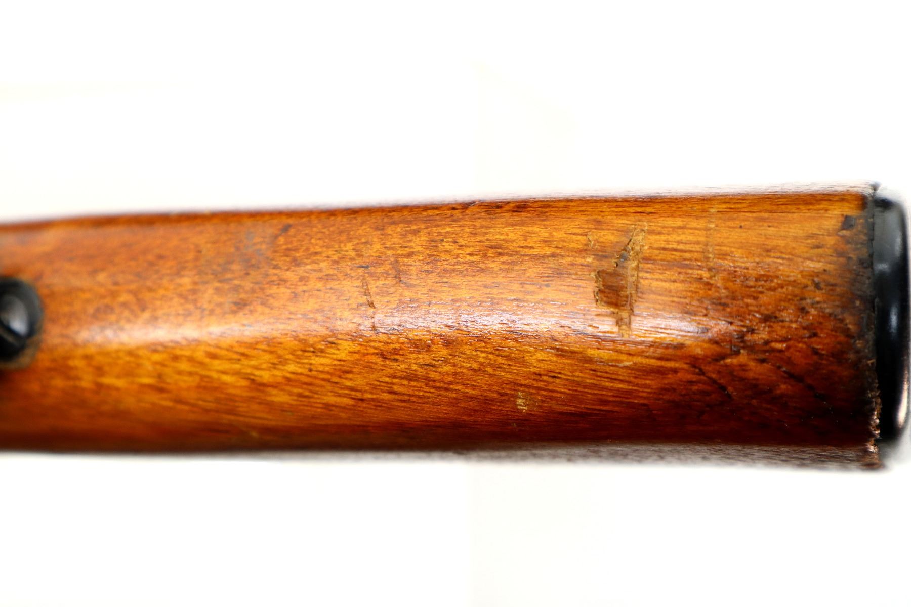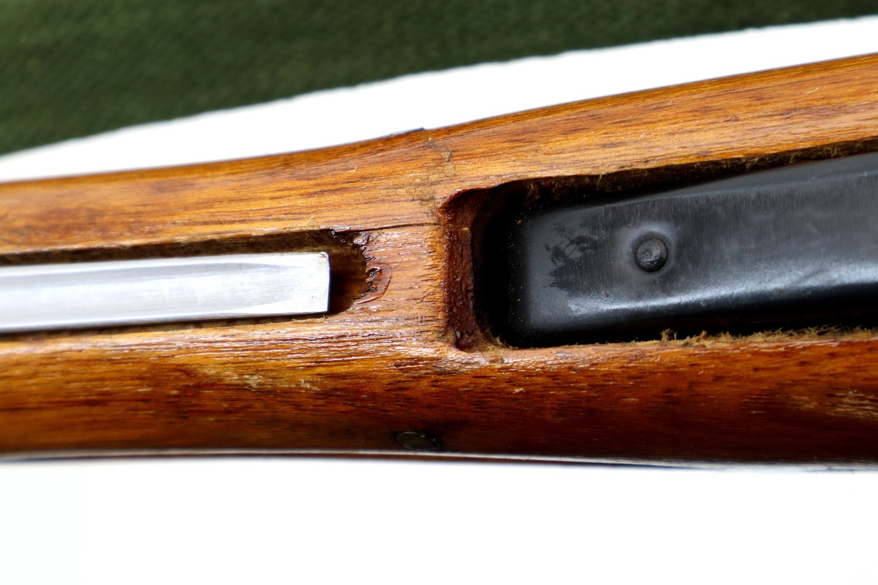Main Description: Visible serial numbers match. Post front sight with hood and ramp, adjustable u notched rear sight, blued finish, silver bolt and carrier. Two piece full military wood stocks, ventilated handguard, finger grooved forearm, pistol grip, smooth steel butt plate with trap, sling swivels with Leather and Green Canvas military sling, cleaning rod, attached folding cruciform bayonet, cracked rear of channel.