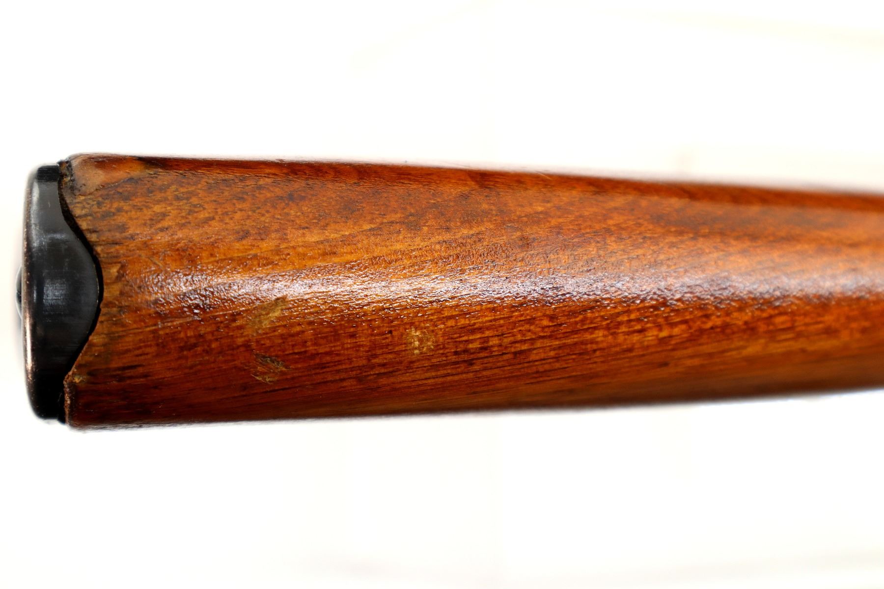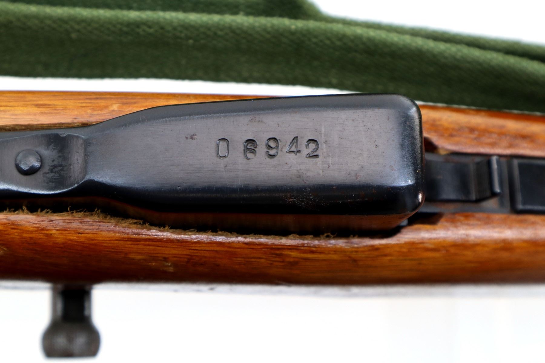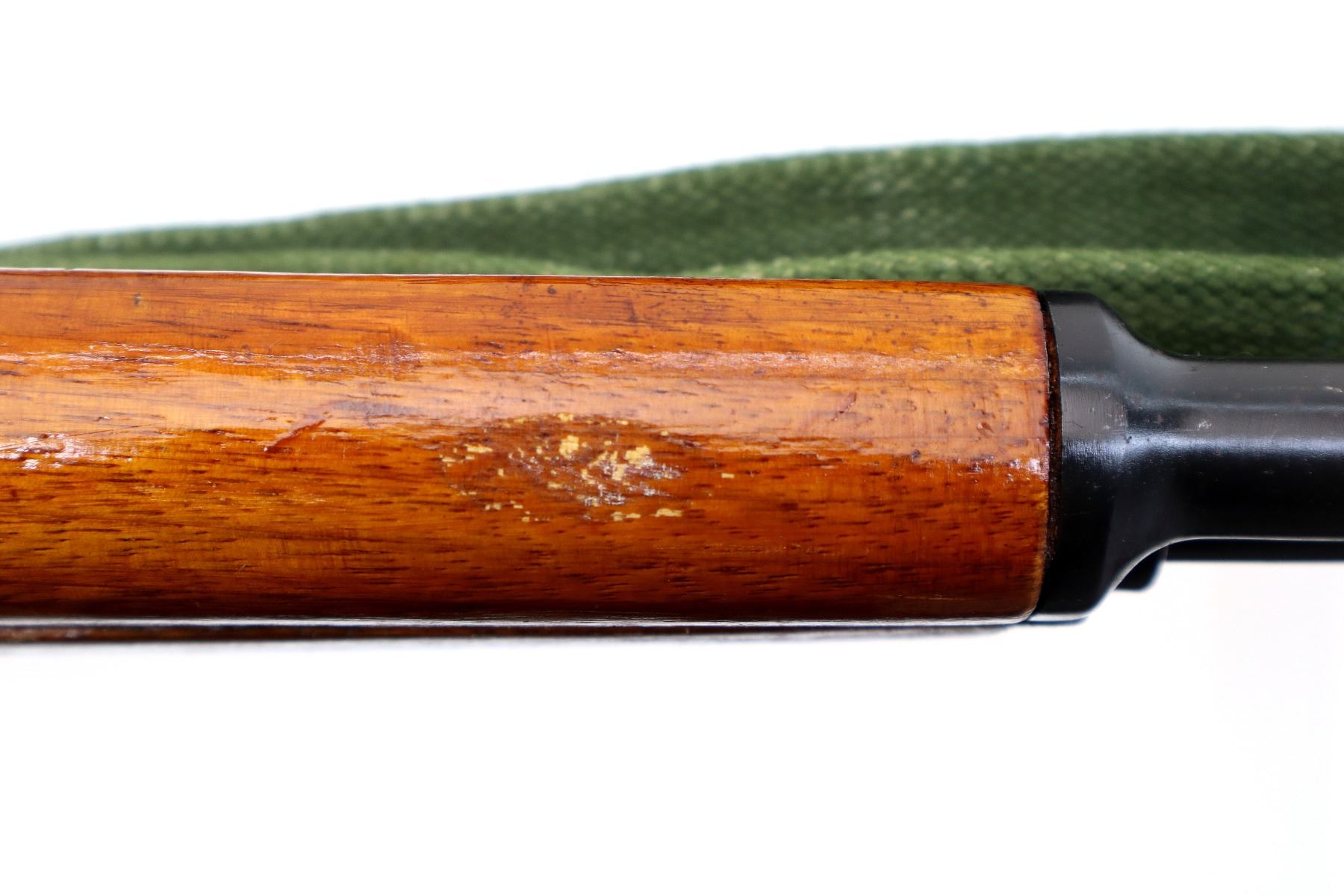 Main Description: Visible serial numbers match. Post front sight with hood and ramp, adjustable u notched rear sight, blued finish, silver bolt and carrier. Two piece full military wood stocks, ventilated handguard, finger grooved forearm, pistol grip, smooth steel butt plate with trap, sling swivels with Leather and Green Canvas military sling, cleaning rod, attached folding cruciform bayonet, cracked rear of channel.