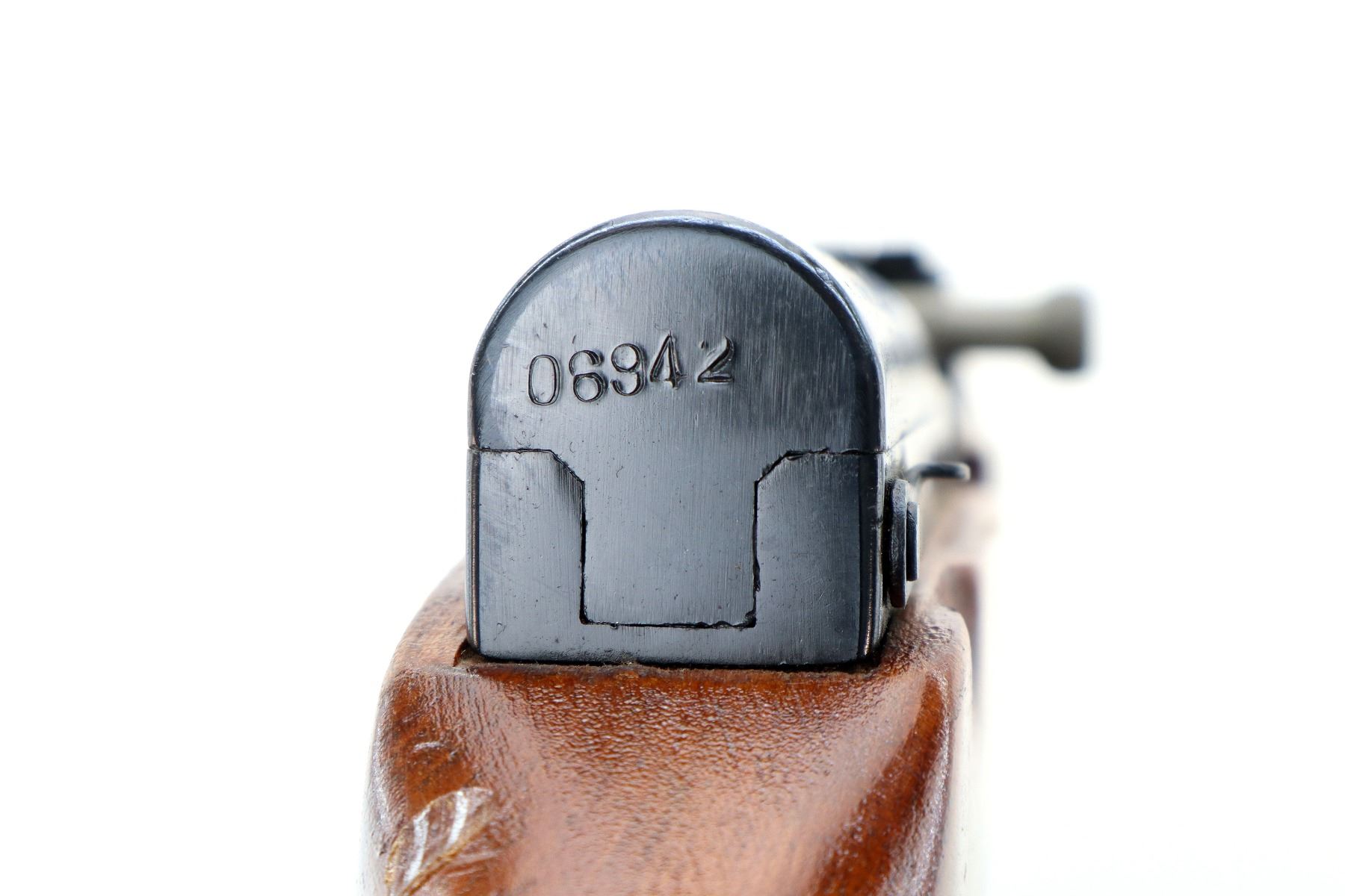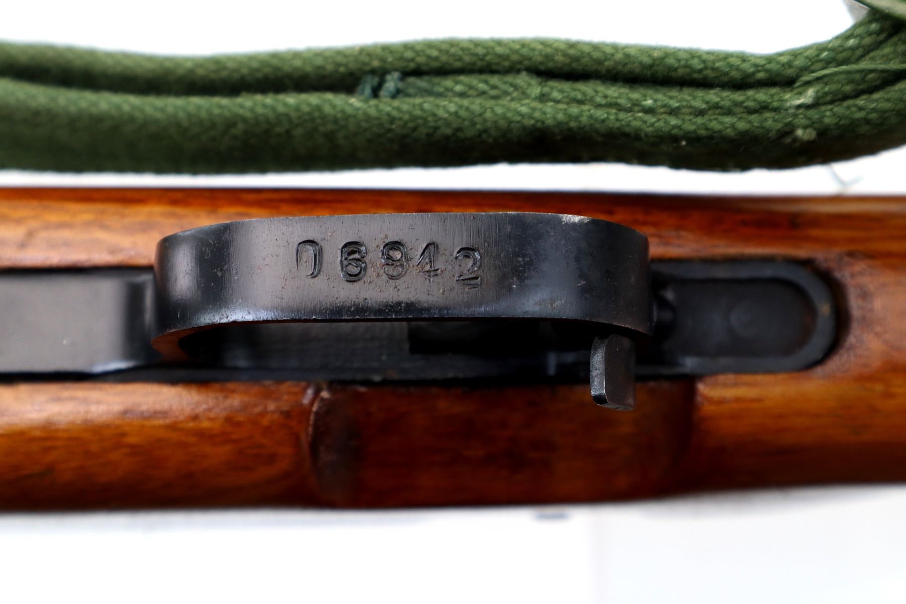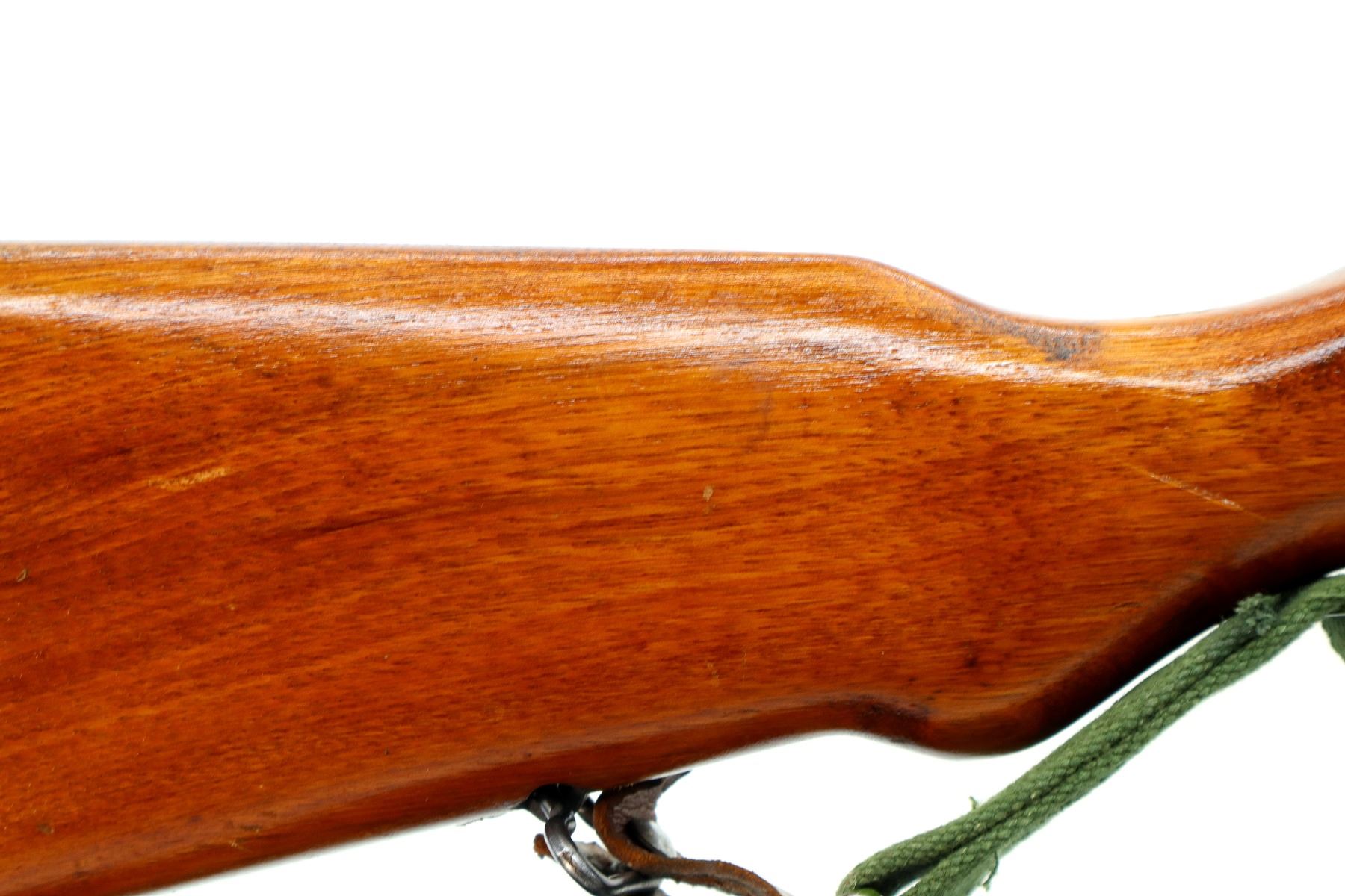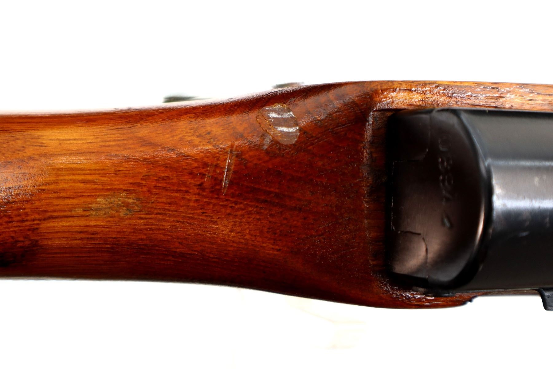 Main Description: Visible serial numbers match. Post front sight with hood and ramp, adjustable u notched rear sight, blued finish, silver bolt and carrier. Two piece full military wood stocks, ventilated handguard, finger grooved forearm, pistol grip, smooth steel butt plate with trap, sling swivels with Leather and Green Canvas military sling, cleaning rod, attached folding cruciform bayonet, cracked rear of channel.