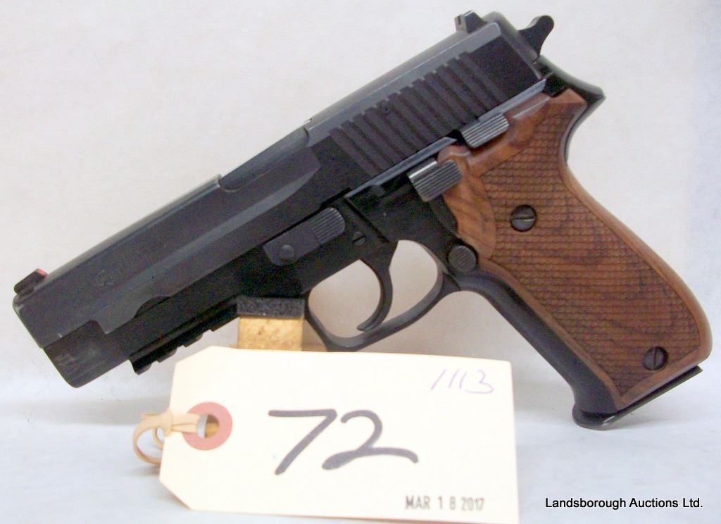 RESTRICTED, SEMI AUTO, 9MM LUGER, 112MM BARREL, SN A033007. WOOD GRIPS VERY GOOD, MATTE FINISH HAS SOME WEAR, BORE EXCELLENT. COMES WITH THREE MAGS, HOLSTER AND MAG HOLSTER.