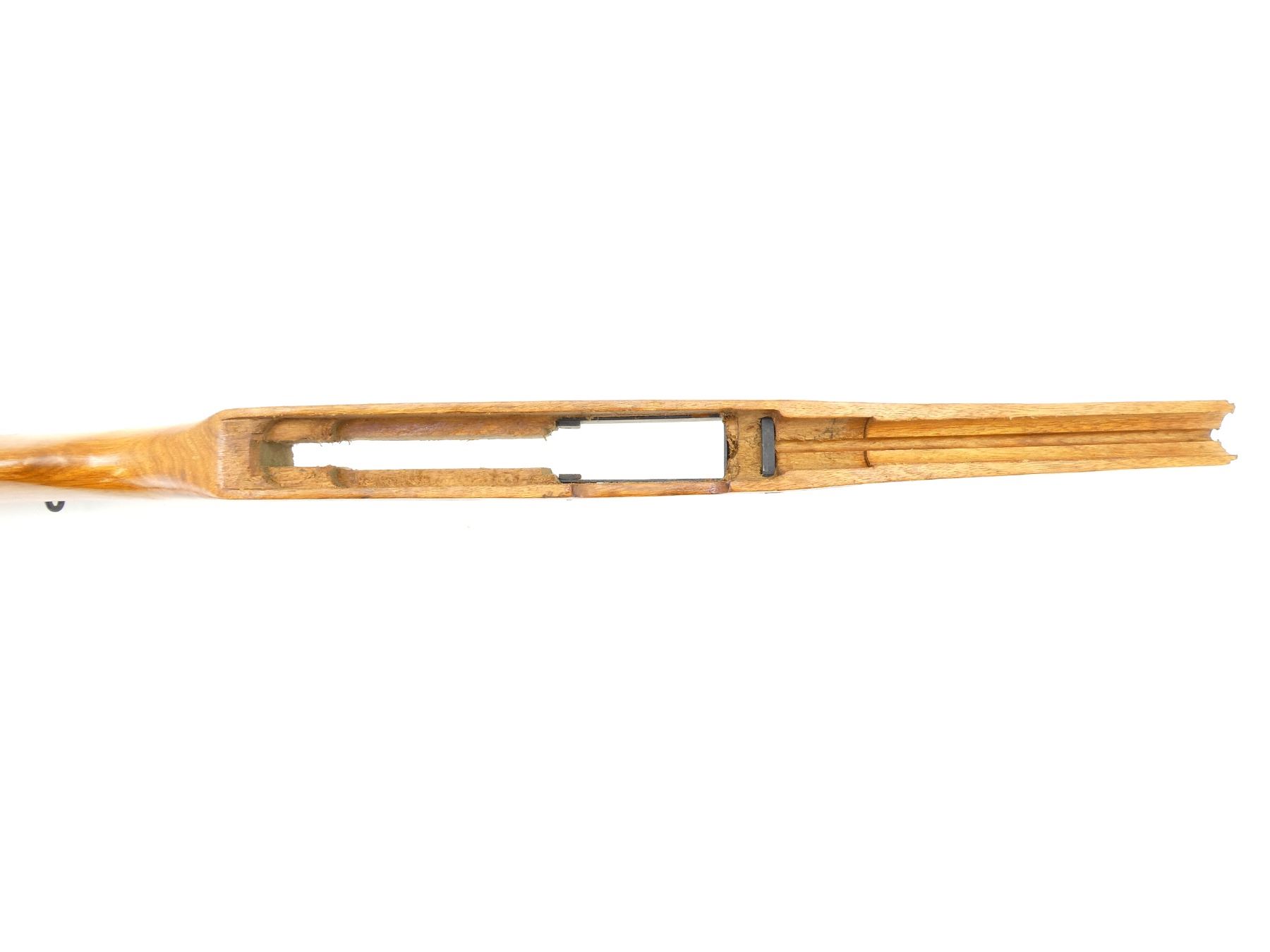 (1) WOODEN CONSTRUCTION, SMOOTH, UNMARKED, WITH REAR SLING SWIVEL, MAY HAVE SMALL CRACKS & CHIPS, OVERALL LENGTH APPROX. 28 7/8". MAY REQUIRE FITTING. SEE PHOTOS.