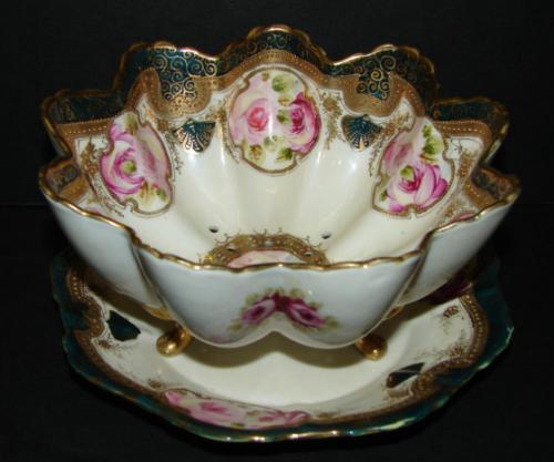 NORITAKE (1906+) PORCELAIN STRAINER BOWL WITH UNDERPLATE. Bowl and underplate are decorated with hand painted pink and lavender rose decoration with gilt jeweled decoration. Bowl has strainer holes at bottom and rests on 3 gilt feet. Bowl and plate are