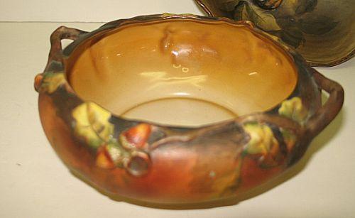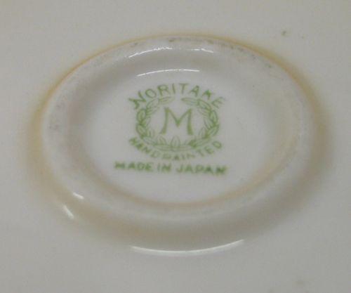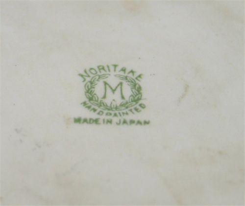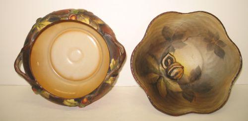 PAIR OF NORITAKE BOWLS. Consists of one walnut relief decorated and hand painted bowl. Bowl rests on three walnut feet. 2.25” H, 7.25” Dia. Also consists of one acorn relief decorated and hand painted console bowl. Bowl has two branch form handles. 2.5” H, 5.25” Dia. Both are marked on bottom with green Noritake wreath mark.