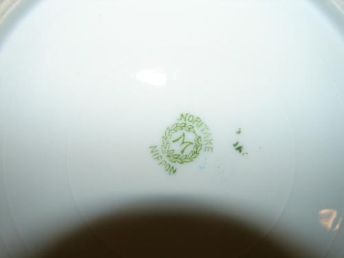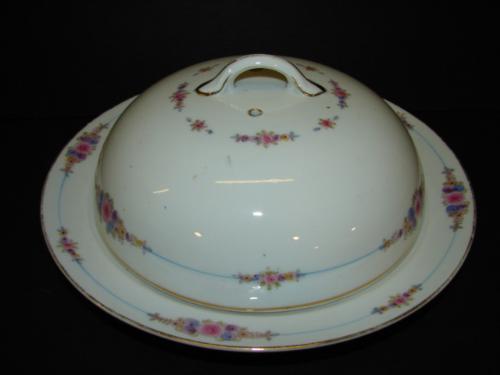 NORITAKE (1911+) PORCELAIN PANCAKE DISH WITH LID. Hand painted floral decorated with gilt band decoration around border of plate and lid. Marked on bottom with Noritake Nippon green wreath mark. 4” H, 8.75” Dia.