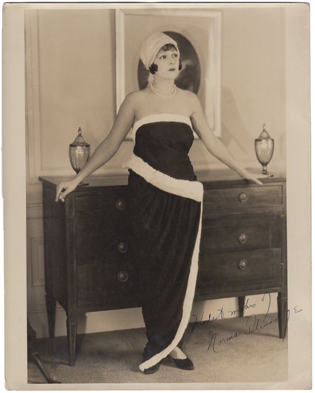 (1893 - 1957) American film actress, a star of the silent screen who founded her own production company. S.P. 8" x 10" sepia photograph of Tallmadge standing full-length in a sleeveless dress. Signed at the lower right. Minor creases at corners, else very good. Together with an I.S.P.8" x 10" sepia bust photo inscribed at the lower right. Trimmed at margins, scratch at left, small tear at bottom, else very good.