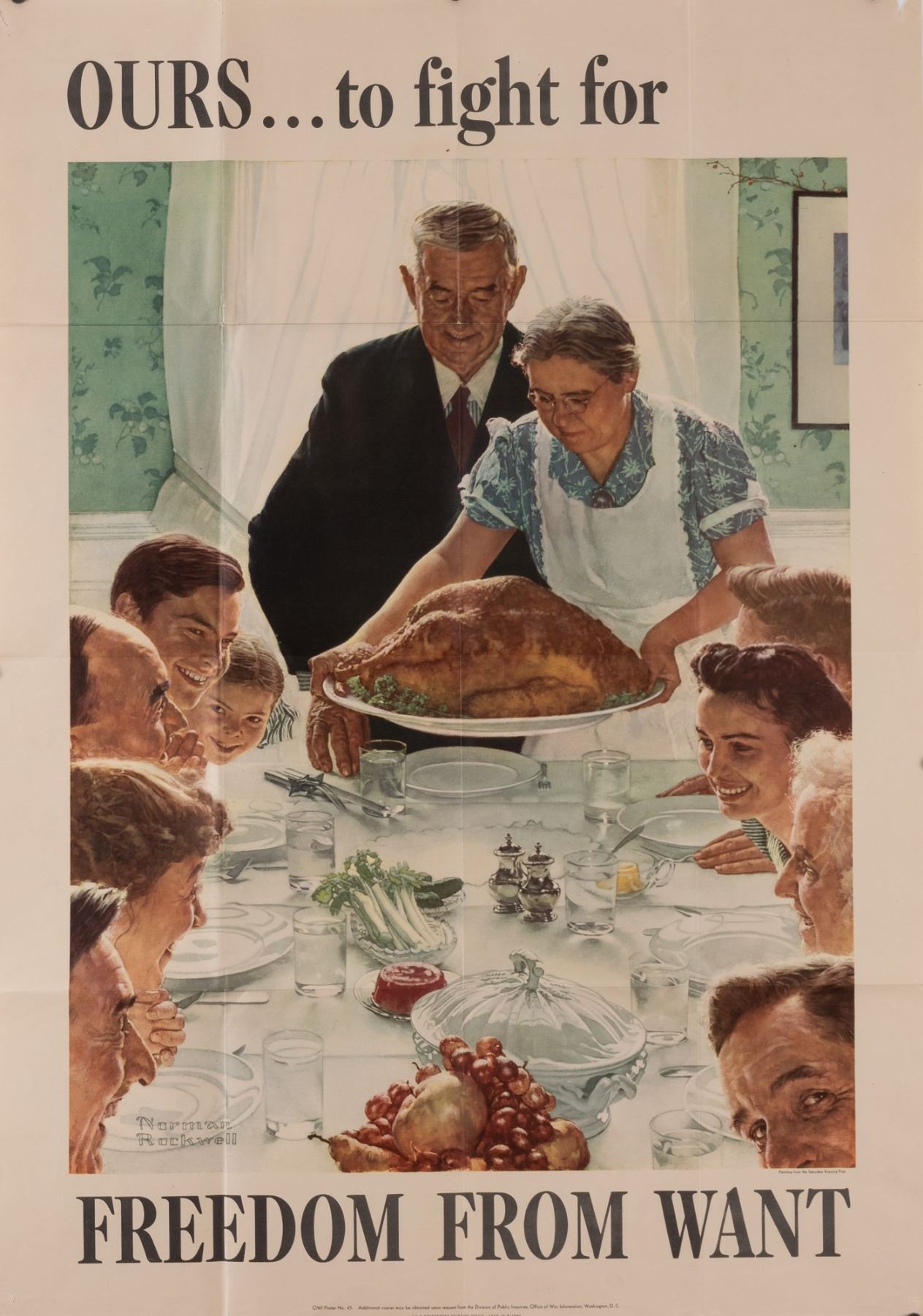 Norman Rockwell's Four Freedoms poster 'Ours...to fight for - Freedom from Want', artwork by Norman Rockwell, (1894-1978), originally made for the Saturday Evening Post, OWI Poster No. 45, U.S. Government Printing Office 1943-O-511886, 28.5 x 40 inches. Folds, minor loss at top edge, and minor abrasions along folds.