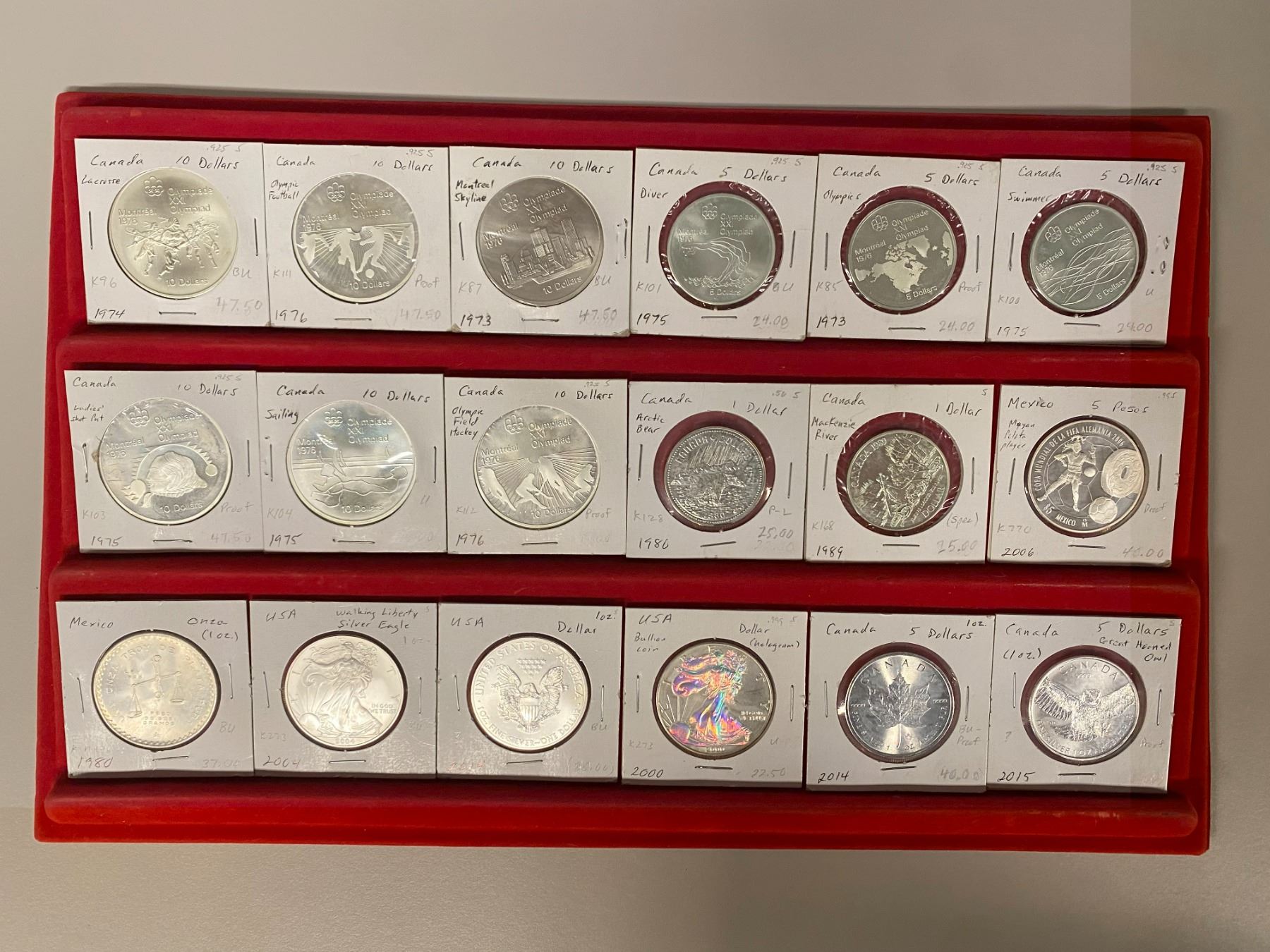 NORTH AMERICA: LOT of 18 coins, including 3 US walking liberty ounce coins (one hologram), 2 of Mexico (one 1980 onza and 2006 5 pesos KM770), and 13 of Canada (9 1976 Olympics, 2 1-ounce $5 and 2 $1 coins); retail value $800, lot of 18 pieces.