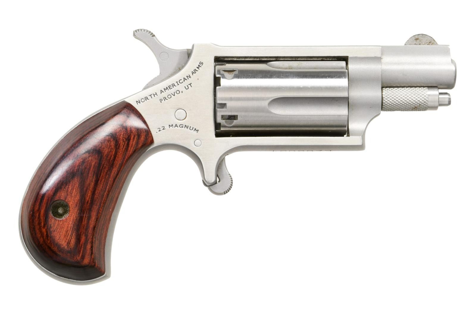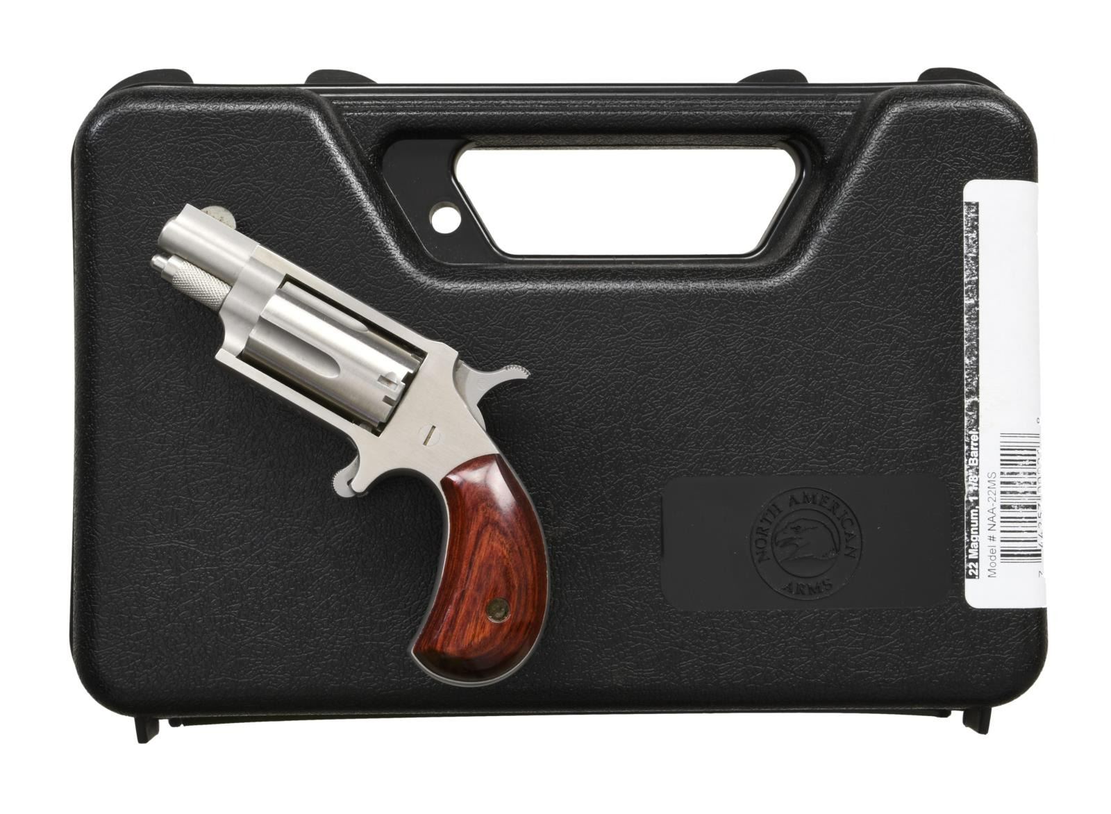 Cal. .22 Magnum. S# E268034. Bbl 1 1/4". Stainless steel finish w/ 2-piece smooth wood birds head grips. Half-moon front sight. UNATTACHED ACCESSORIES: matching black plastic factory hard case. CONDITION: very good, with metal components exhibiting some light superficial marks from handling and storage. Cyl. bears a light dragline. Very bright bore, exhibiting strong rifling throughout. Grips show some light superficial marks, but are otherwise very good. Hard case is very good. PROVENANCE: From the estate collection of Thomas J. Mulligan. (23-2205/MLW). MODERN. $200-300.