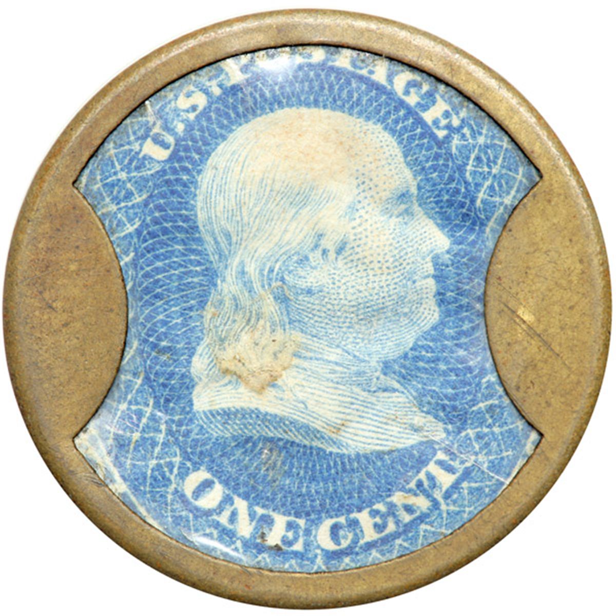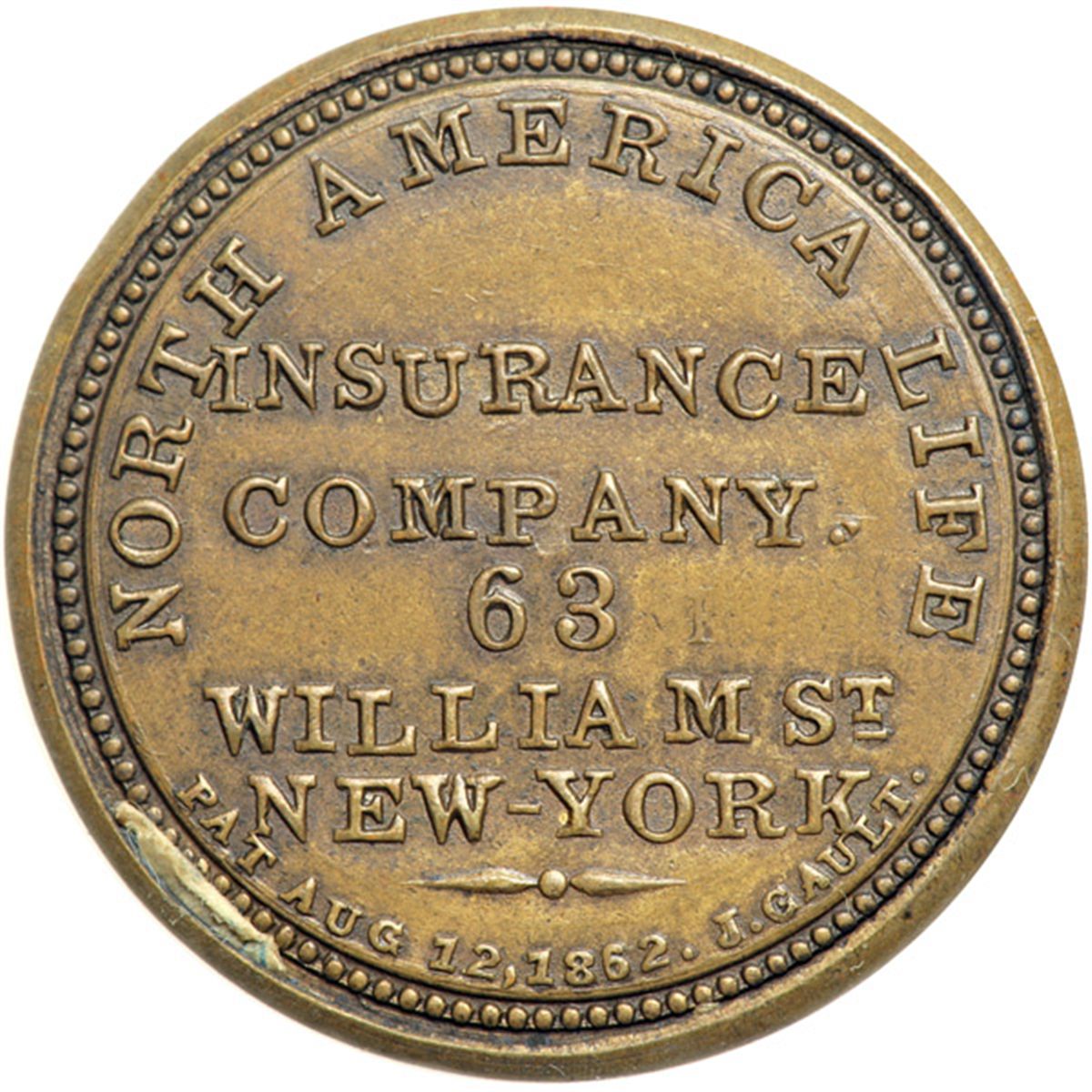 "NORTH AMERICAN LIFE INSURANCE COMPANY" EP-24, HB-188, S-140a, 1¢ "INSURANCE" in straight line. . Fr-EP-24. This higher grade piece has nearly full color on the stamp, although there are a couple of small yellowed areas. The mica is lightly crazed with no serious flaws. The case is completely original and is a gorgeous light brown color with just a touch of wear on the highest points, and has lighter tan coloring in the protected areas of the design. Extremely Fine.