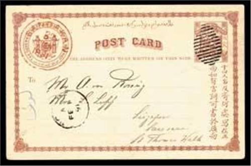 1891 3c brown P/S card from Sandakan commercially used to Singapore, cancelled by oval of bars in black with Sandakan cds for JA.22.1891 in red struck directly on the coat of arms in top left corner, Singapore receiving cds for FE.1.1891 below, fine and a