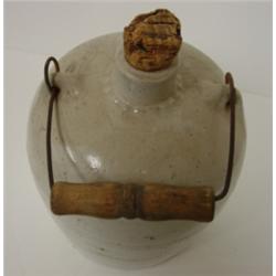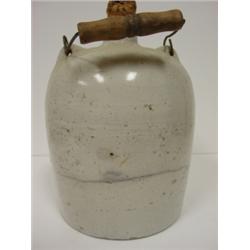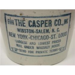 Stoneware jug with metal and wooden handle and blue text on body. Text reads "The Casper Co., Winston-Salem, N.C., New York-Chicago-St. Louis, Largest and lowest priced mail order whiskey house, Send for private terms". Has crazing near top of body and hairline along back of body measuring approx. 6.5" in length. 9.5" H