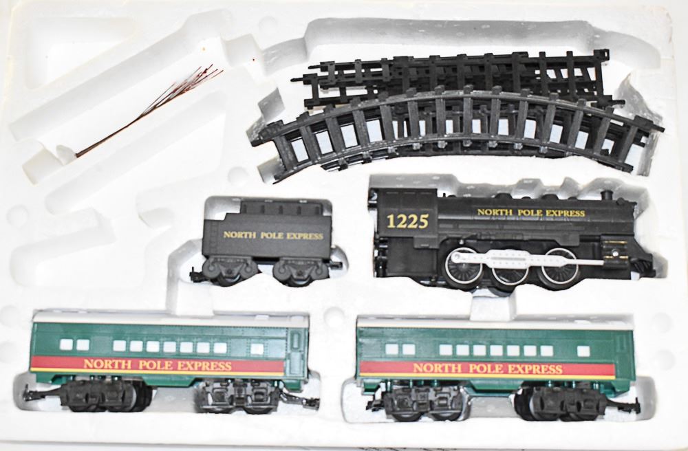 NORTH POLE EXPRESS TOY TRAIN WITH ENGINE COAL CAR AND TWO ROLLING STOCK. SOME TRACKS INCLUDED AND SOME PARTS MISSING.