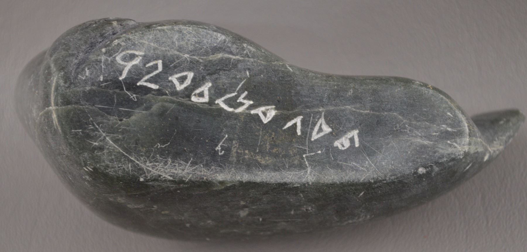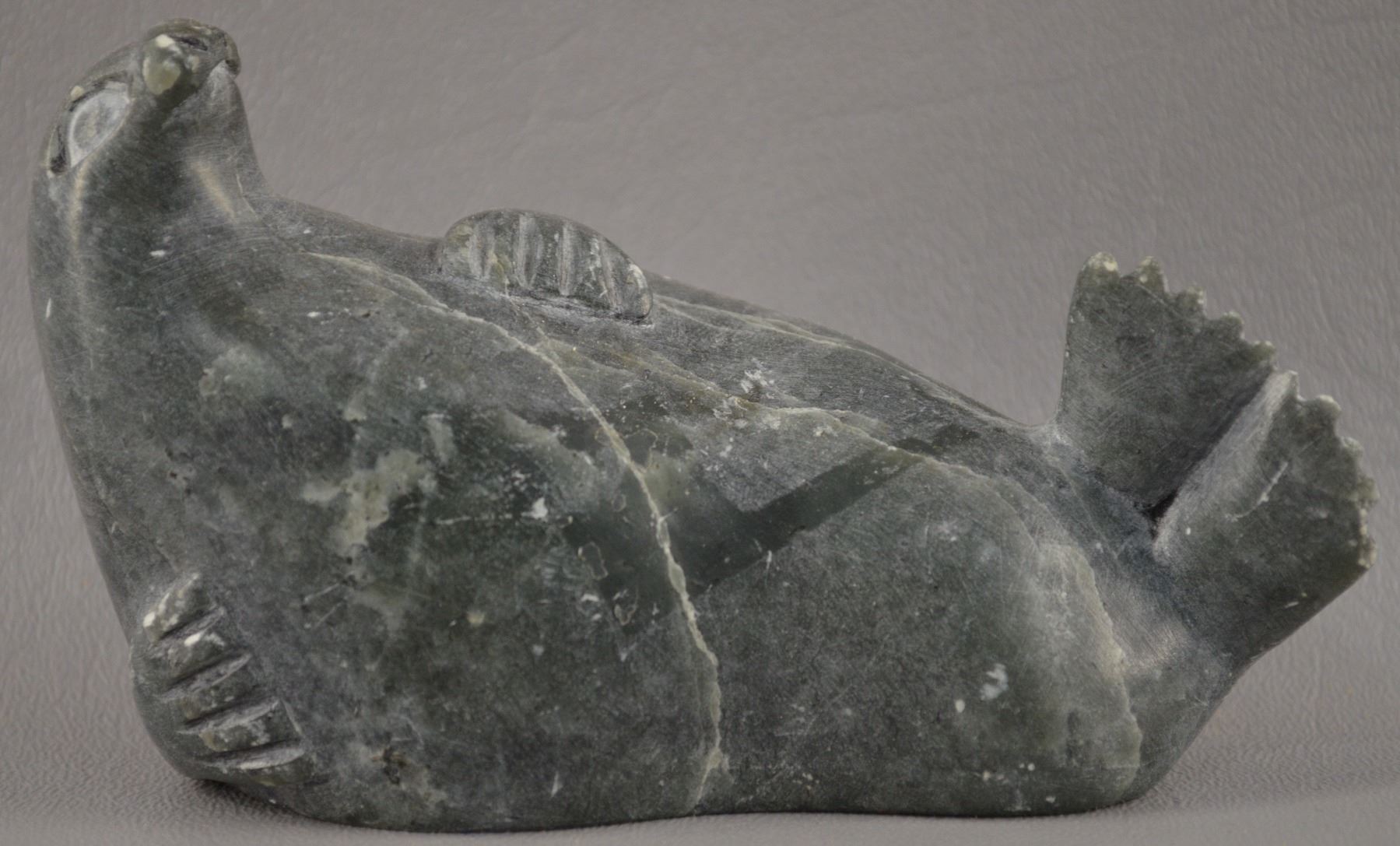 1992. Hand carved from stone depicting walrus. Has minor scrapes and is signed on bottom.