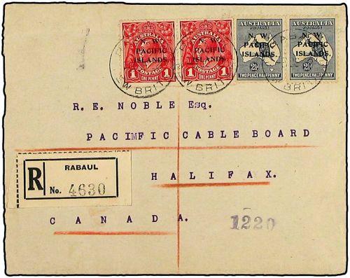 1922 Registered cover to CANADA, franked with horizontal pairs of 1 d. and 2 1/2 d. (SG 103, 107), all tied by RABAUL/NEW BRITAIN cds. Front shows black Registration label, and reverse bears SYDNEY/N.S.W. transit, three Canadian RPO cancels (CAL + VAN, NORTH BAY + FORT WILLIAM and HALIFAX + CAMPBELLTON), plus HALIFAX arrival datestamp. A scarce and colorful Registered cover.