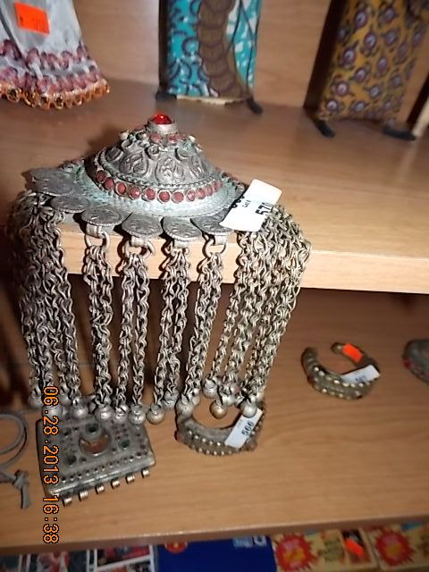NORTHERN INDIA - AMULET CONVEX SURYA SUN - CHAINS HANGING DOWN WITH GHUNGRUS (SMALL BELLS) - DECORATED WITH HEARTS AND GLASS STONES - RED & BLACK (SOME MISSING)